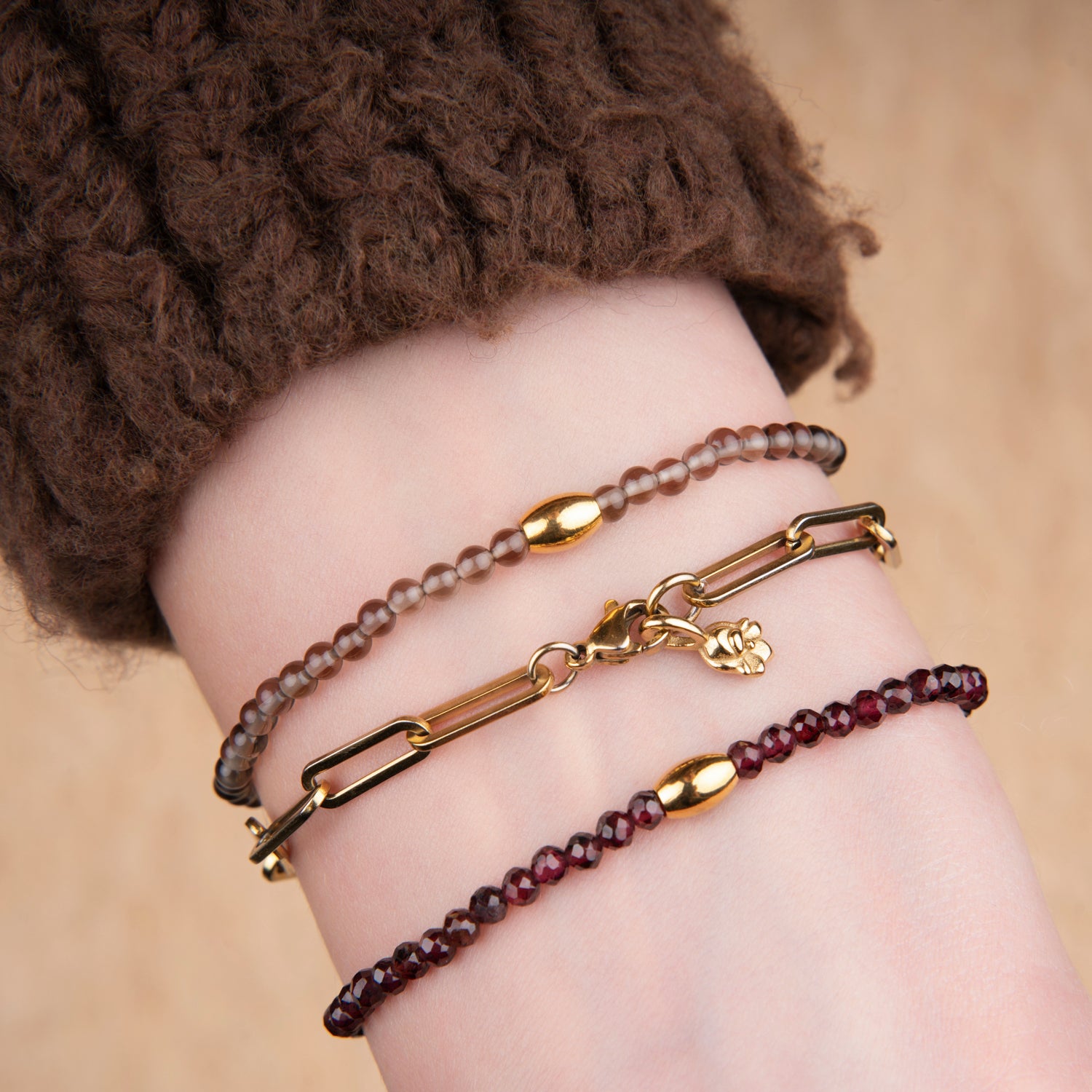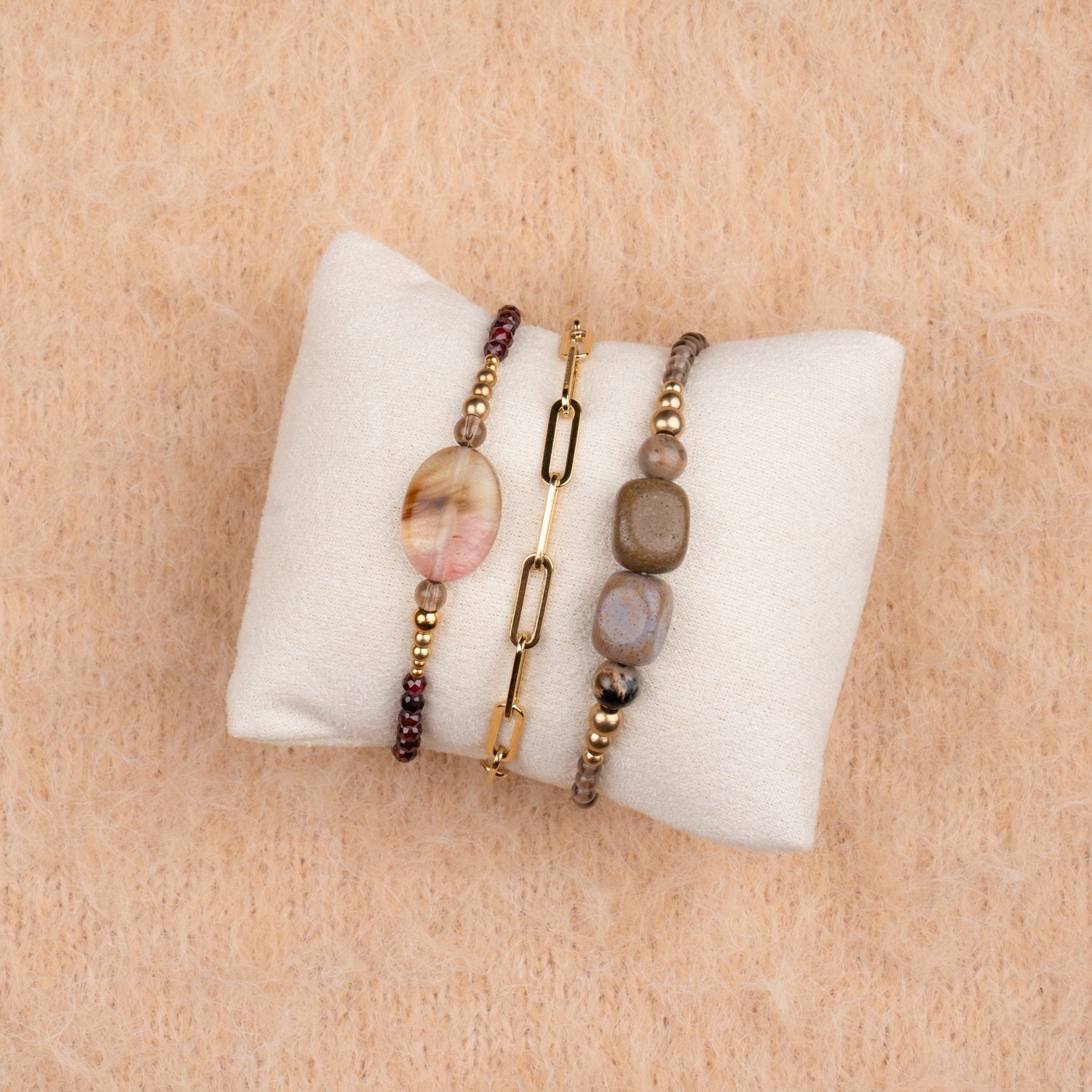 Elke unieke armband is met liefde met de hand samengesteld — een harmonieuze mix van prachtige stenen, gekozen om hun kleur, energie en karakter. De gouden kralen zijn gemaakt van roestvrij staal, zodat je armband mooi blijft tijdens het dragen. Van iedere armband is er maar één beschikbaar, zo draag je altijd een sieraad dat echt alleen van jou is.