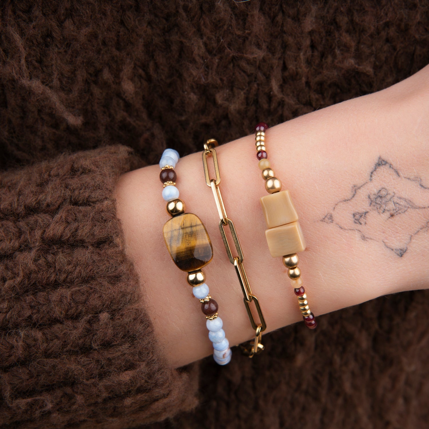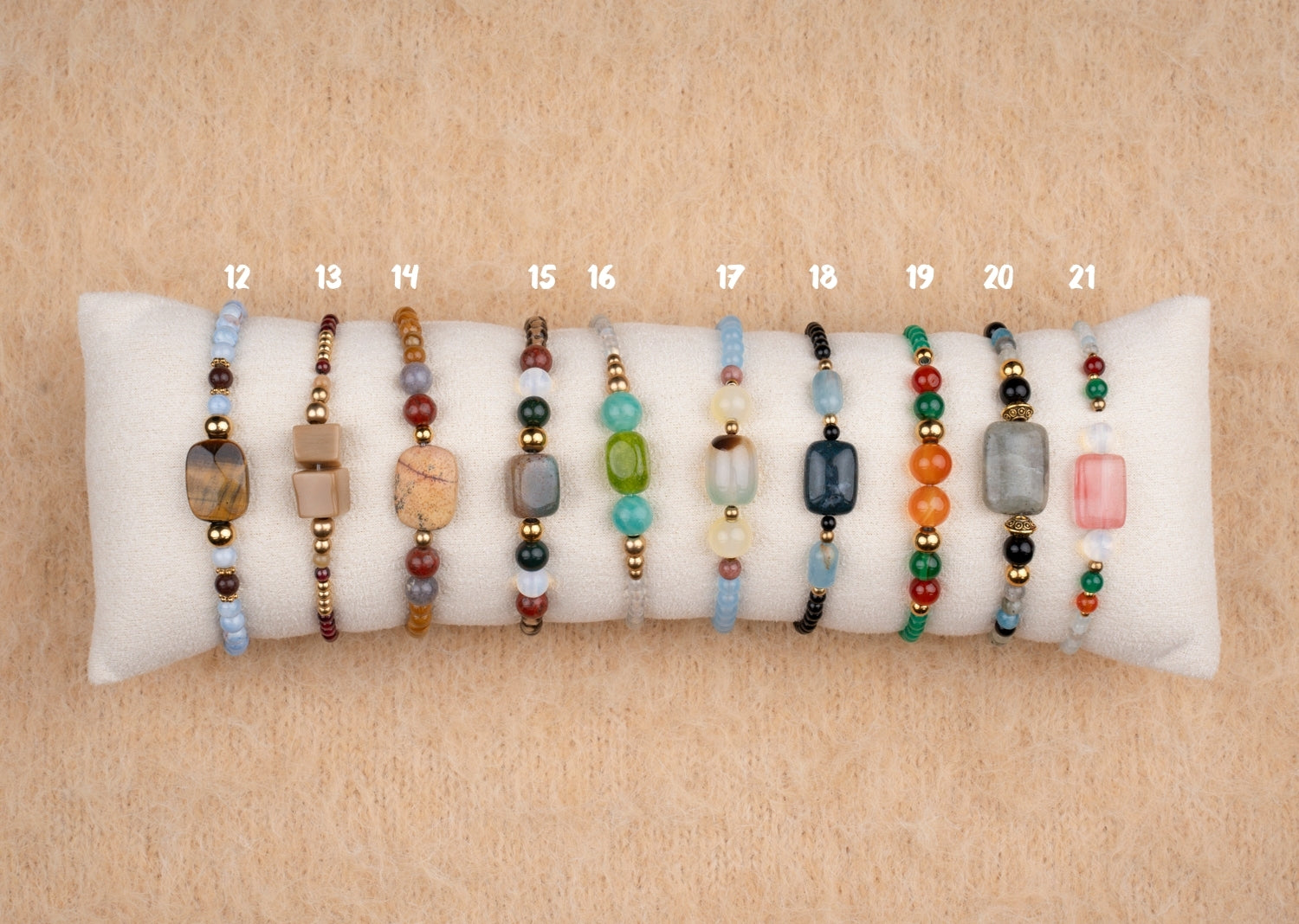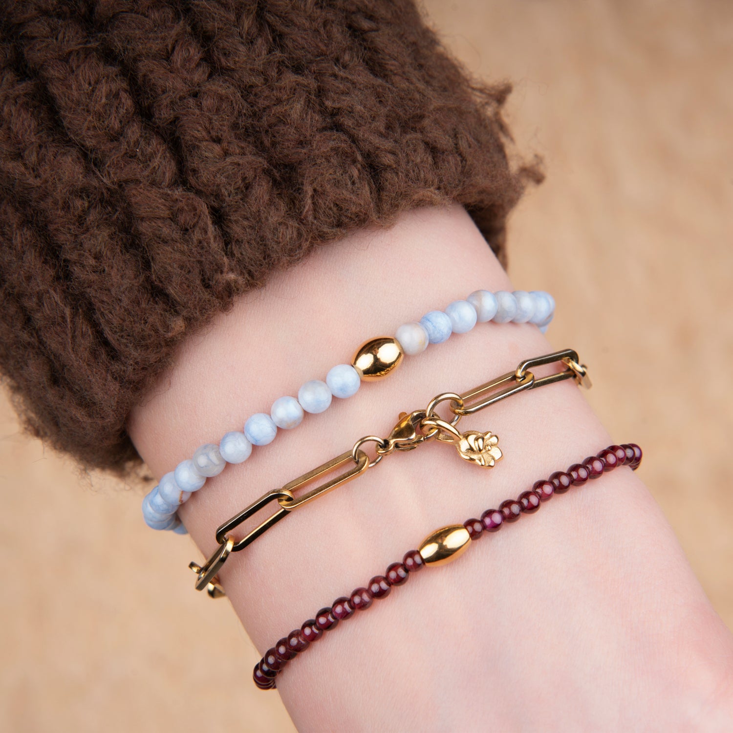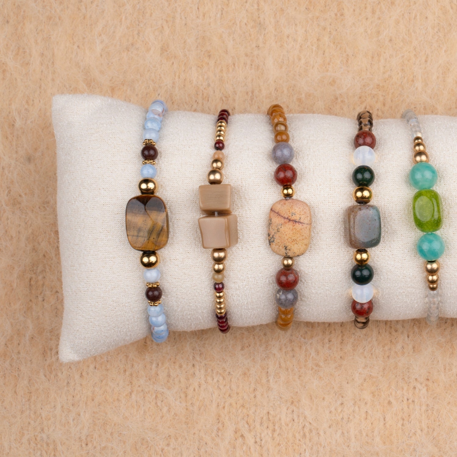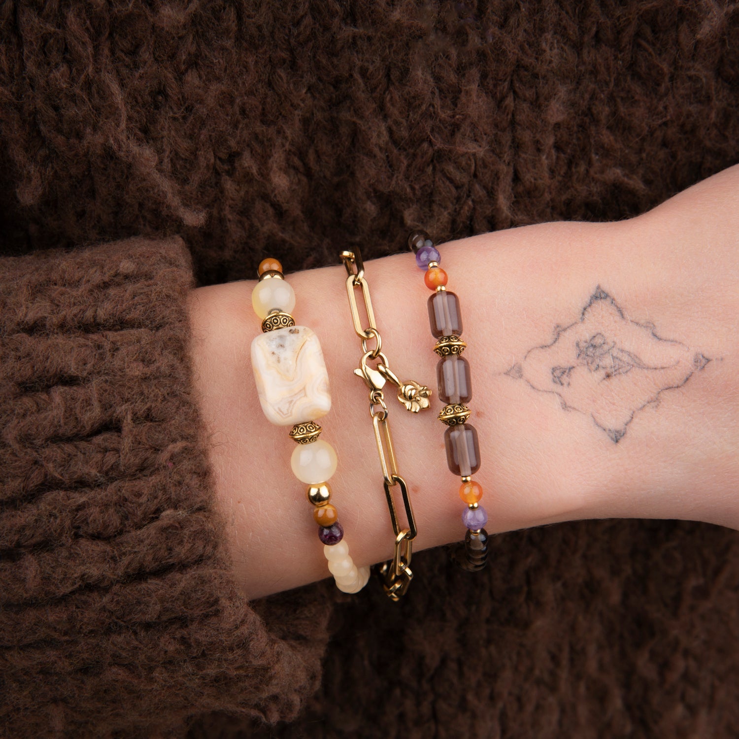 Elke unieke armband is met liefde met de hand samengesteld — een harmonieuze mix van prachtige stenen, gekozen om hun kleur, energie en karakter. De gouden kralen zijn gemaakt van roestvrij staal, zodat je armband mooi blijft tijdens het dragen. Van iedere armband is er maar één beschikbaar, zo draag je altijd een sieraad dat echt alleen van jou is.