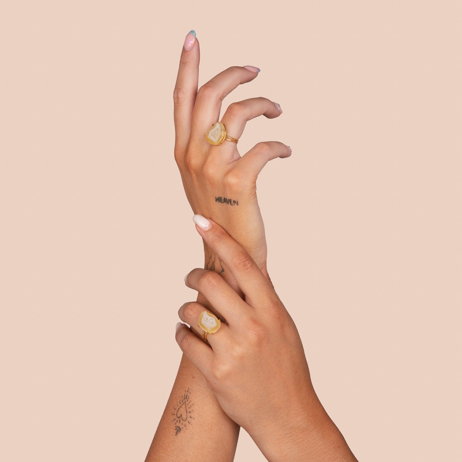 Iedere geode ring is one-of-a-kind door haar natuurlijke vorm en unieke patronen. Geen twee stenen zijn hetzelfde, waardoor je een sieraad draagt dat écht alleen van jou is. Omdat iedere steen uniek is, is er van elk sieraad maar één beschikbaar — uitverkocht is dus ook écht uitverkocht.