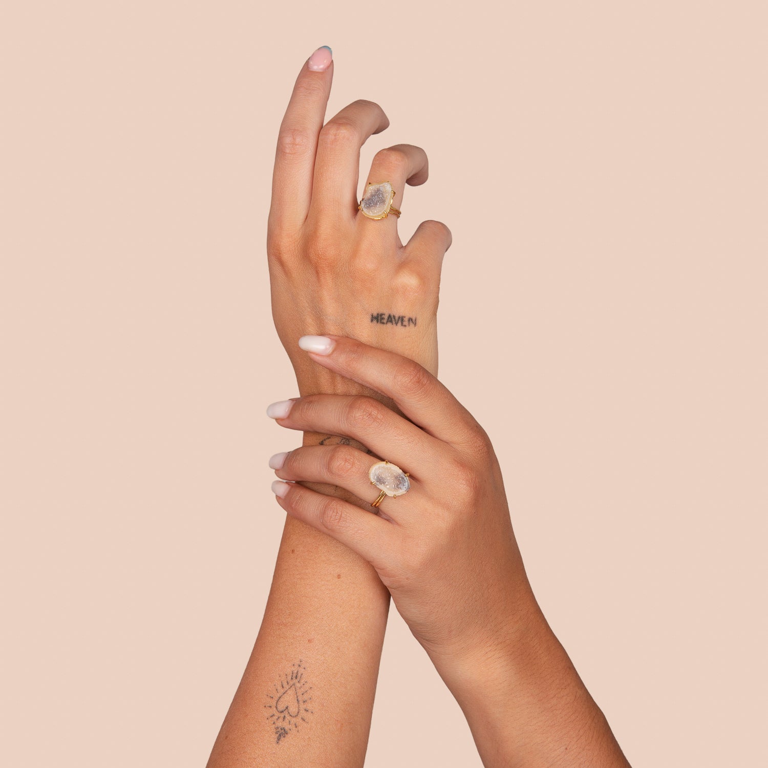 Iedere geode ring is one-of-a-kind door haar natuurlijke vorm en unieke patronen. Geen twee stenen zijn hetzelfde, waardoor je een sieraad draagt dat écht alleen van jou is. Omdat iedere steen uniek is, is er van elk sieraad maar één beschikbaar — uitverkocht is dus ook écht uitverkocht.