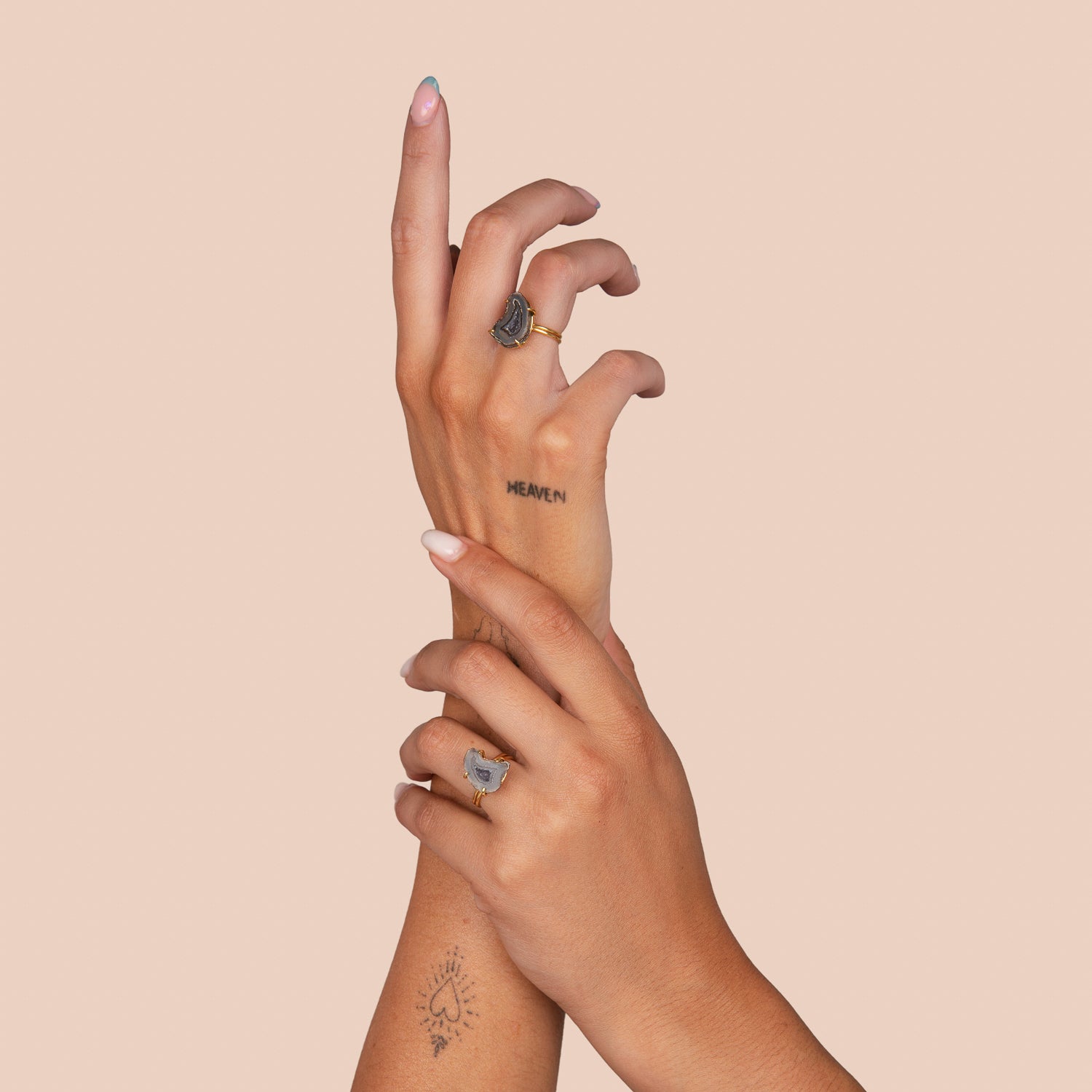 Iedere geode ring is one-of-a-kind door haar natuurlijke vorm en unieke patronen. Geen twee stenen zijn hetzelfde, waardoor je een sieraad draagt dat écht alleen van jou is. Omdat iedere steen uniek is, is er van elk sieraad maar één beschikbaar — uitverkocht is dus ook écht uitverkocht.
