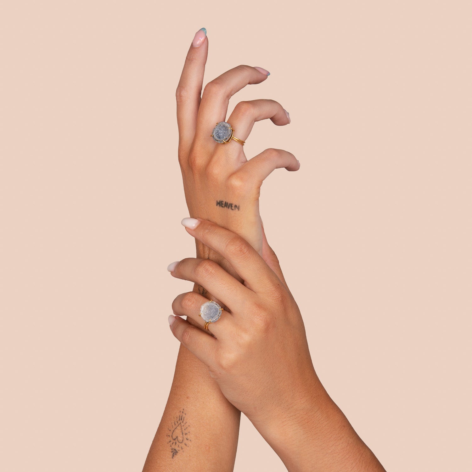 Iedere geode ring is one-of-a-kind door haar natuurlijke vorm en unieke patronen. Geen twee stenen zijn hetzelfde, waardoor je een sieraad draagt dat écht alleen van jou is. Omdat iedere steen uniek is, is er van elk sieraad maar één beschikbaar — uitverkocht is dus ook écht uitverkocht.