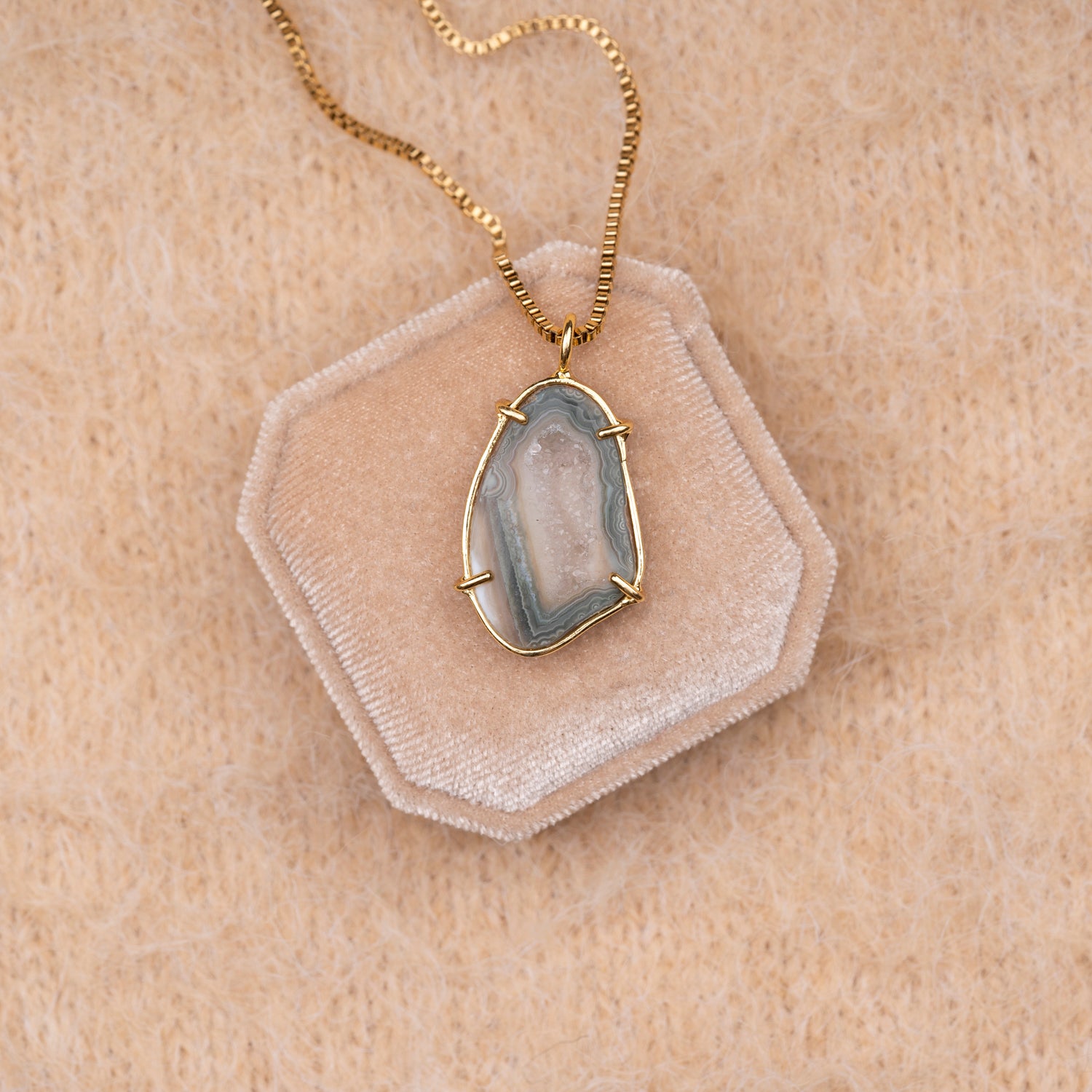 Iedere geode hanger is one-of-a-kind door haar natuurlijke vorm en unieke patronen. Geen twee stenen zijn hetzelfde, waardoor je een sieraad draagt dat écht alleen van jou is. Omdat iedere steen uniek is, is er van elk sieraad maar één beschikbaar — uitverkocht is dus ook écht uitverkocht.