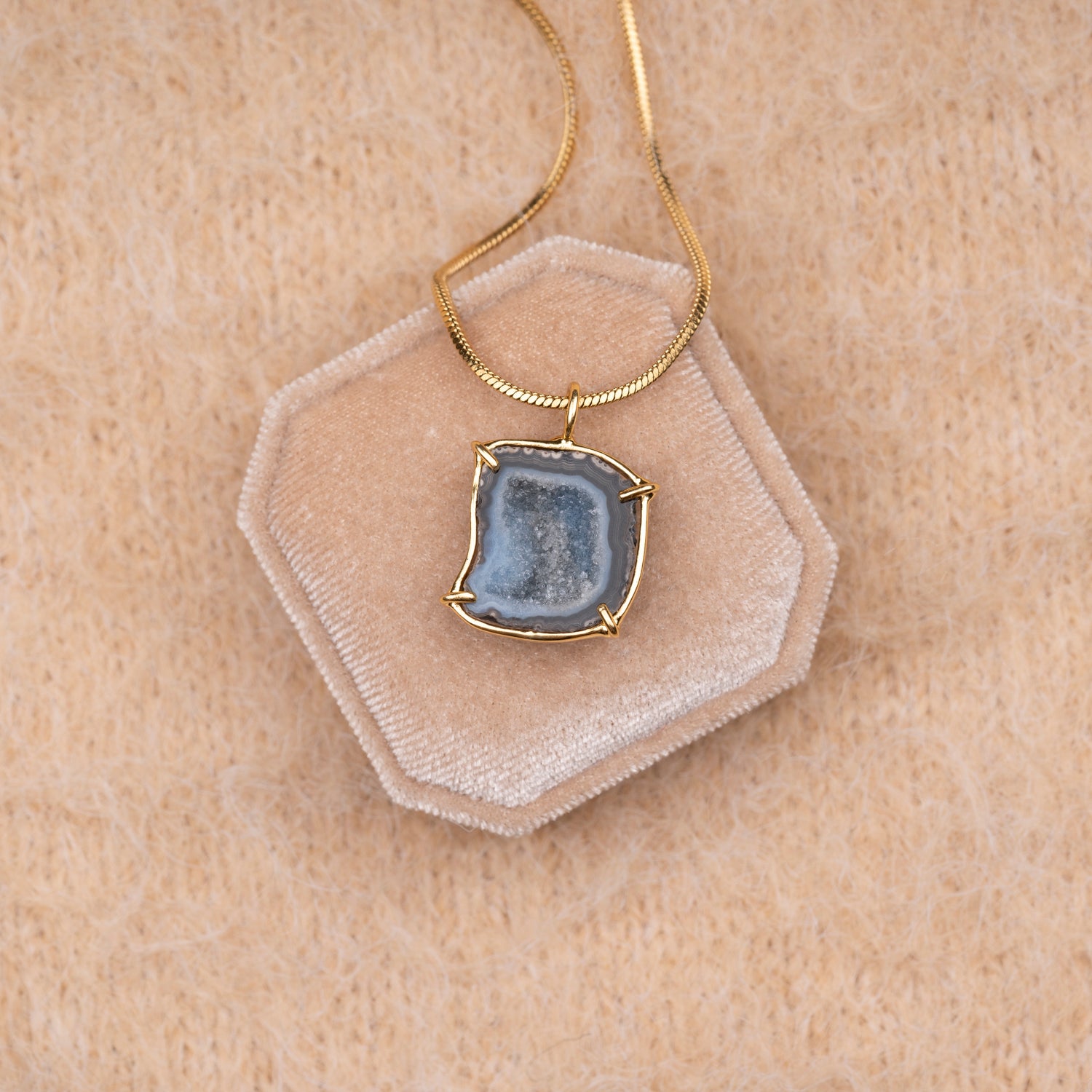 Iedere geode hanger is one-of-a-kind door haar natuurlijke vorm en unieke patronen. Geen twee stenen zijn hetzelfde, waardoor je een sieraad draagt dat écht alleen van jou is. Omdat iedere steen uniek is, is er van elk sieraad maar één beschikbaar — uitverkocht is dus ook écht uitverkocht.