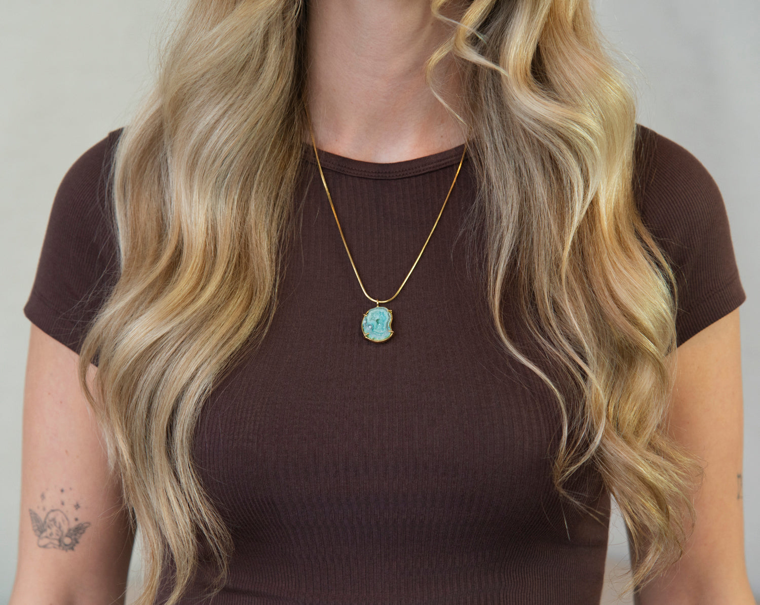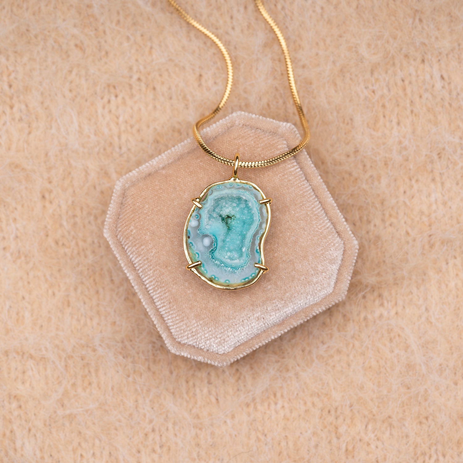 Iedere geode hanger is one-of-a-kind door haar natuurlijke vorm en unieke patronen. Geen twee stenen zijn hetzelfde, waardoor je een sieraad draagt dat écht alleen van jou is. Omdat iedere steen uniek is, is er van elk sieraad maar één beschikbaar — uitverkocht is dus ook écht uitverkocht.
