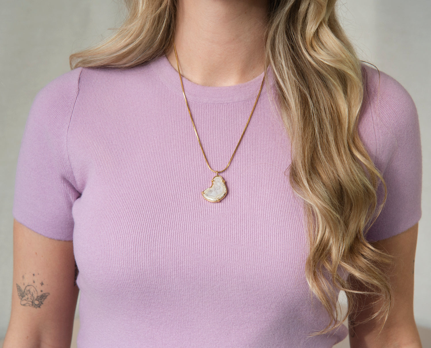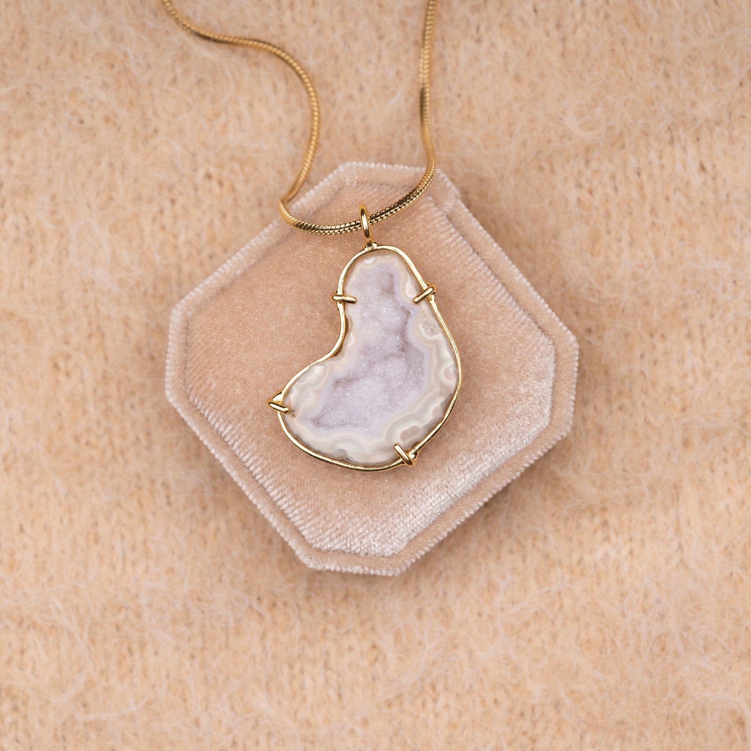 Iedere geode hanger is one-of-a-kind door haar natuurlijke vorm en unieke patronen. Geen twee stenen zijn hetzelfde, waardoor je een sieraad draagt dat écht alleen van jou is. Omdat iedere steen uniek is, is er van elk sieraad maar één beschikbaar — uitverkocht is dus ook écht uitverkocht.