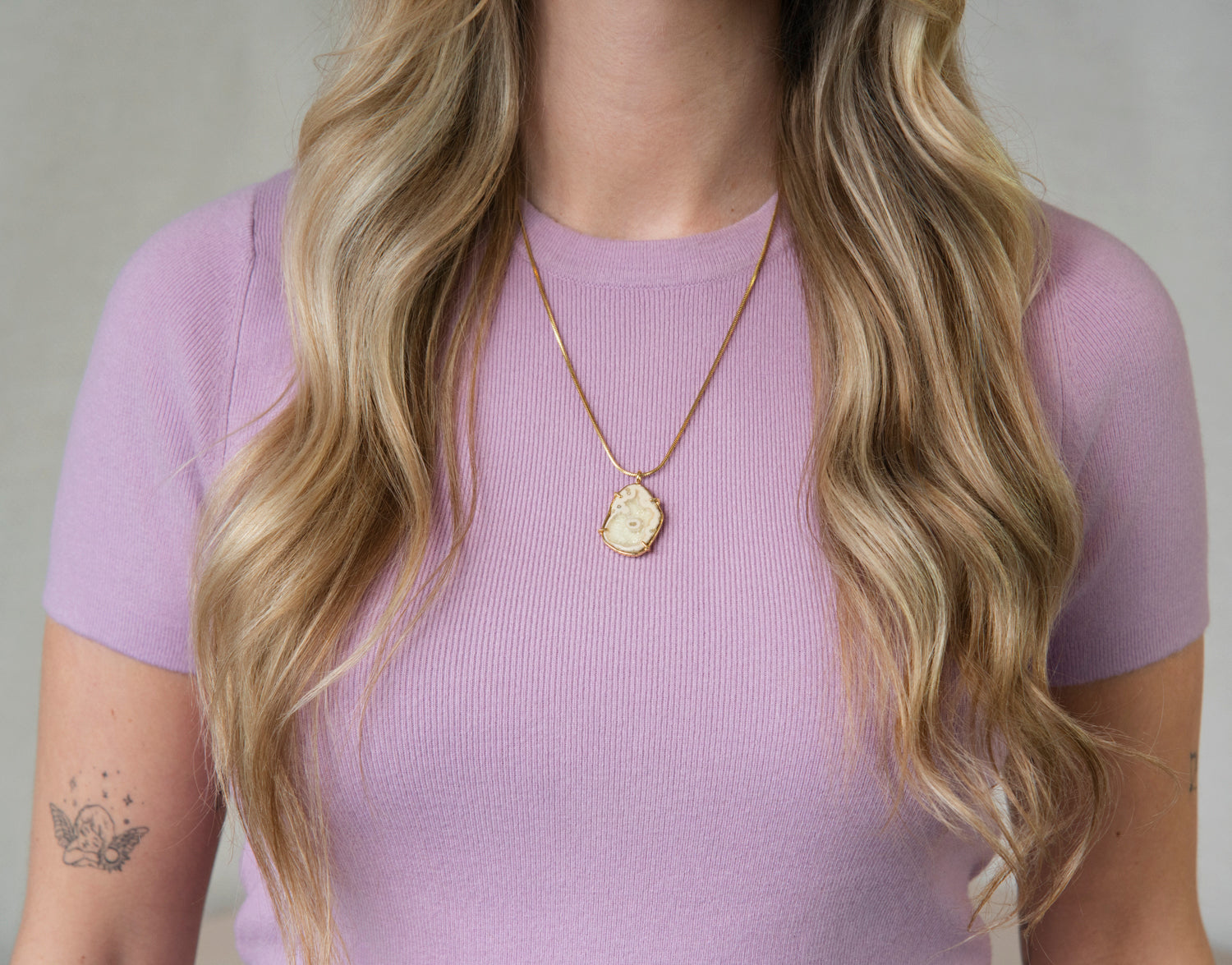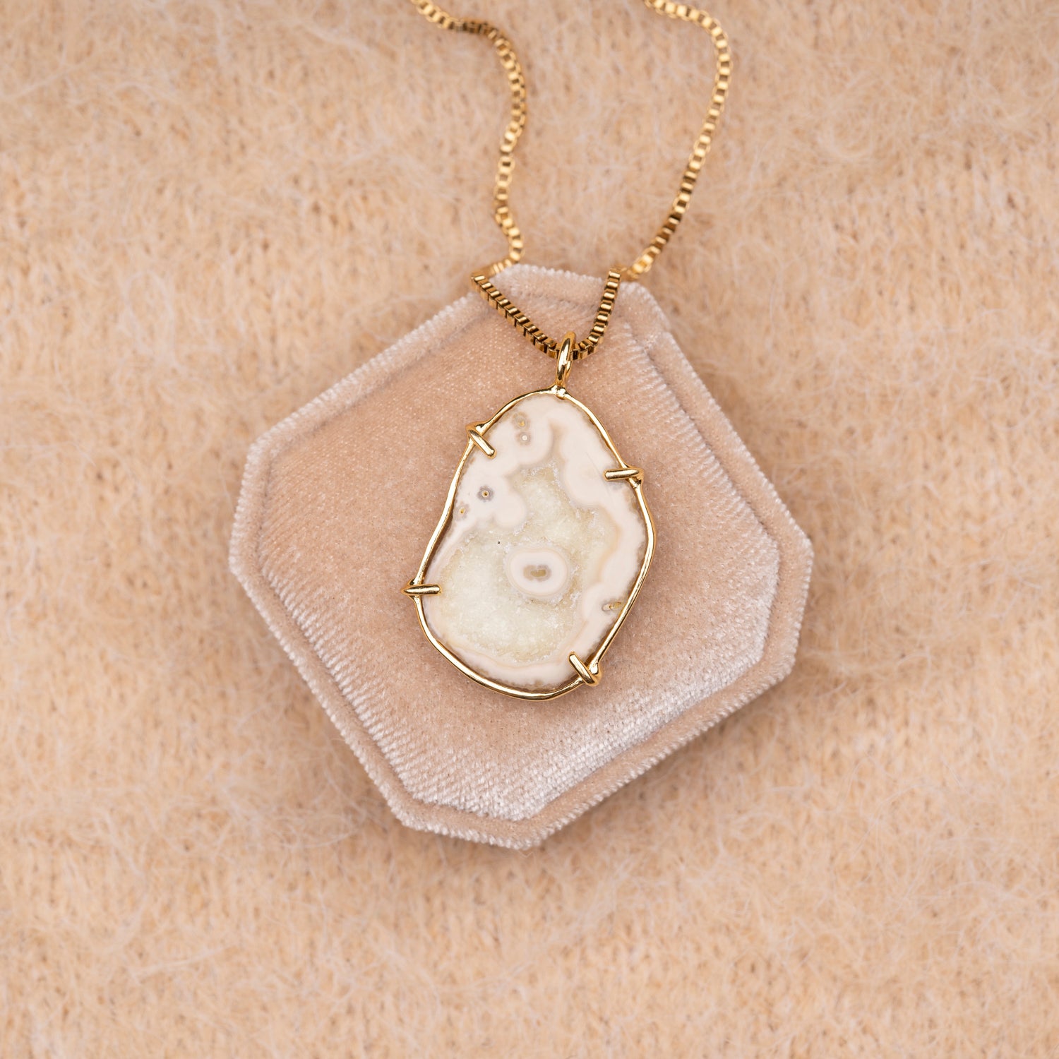 Iedere geode hanger is one-of-a-kind door haar natuurlijke vorm en unieke patronen. Geen twee stenen zijn hetzelfde, waardoor je een sieraad draagt dat écht alleen van jou is. Omdat iedere steen uniek is, is er van elk sieraad maar één beschikbaar — uitverkocht is dus ook écht uitverkocht.