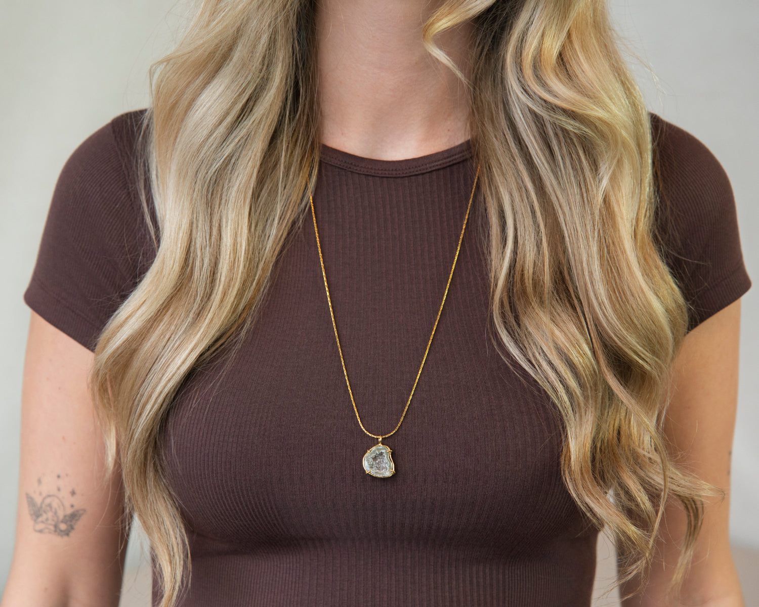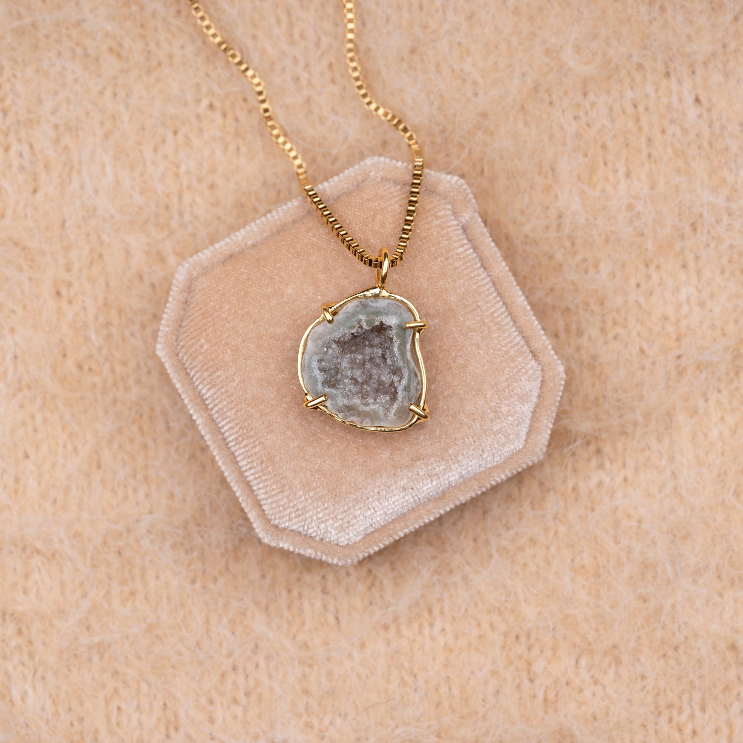 Iedere geode hanger is one-of-a-kind door haar natuurlijke vorm en unieke patronen. Geen twee stenen zijn hetzelfde, waardoor je een sieraad draagt dat écht alleen van jou is. Omdat iedere steen uniek is, is er van elk sieraad maar één beschikbaar — uitverkocht is dus ook écht uitverkocht.