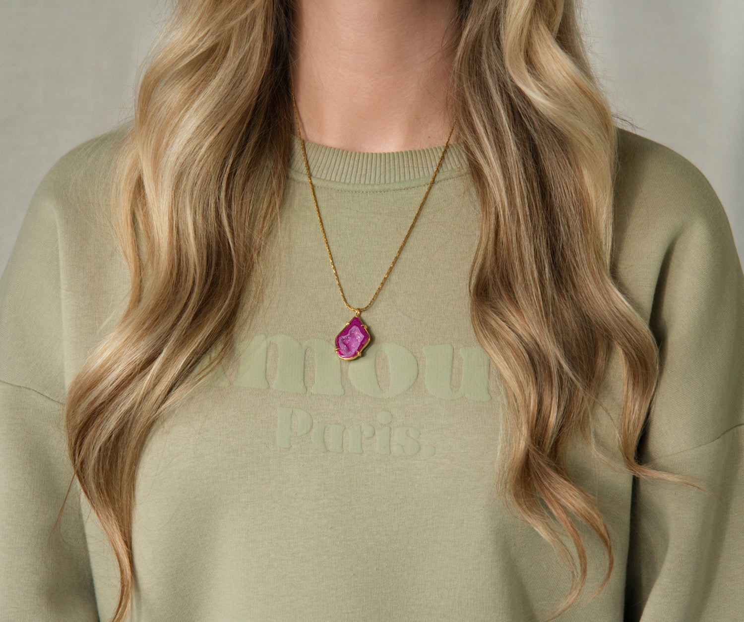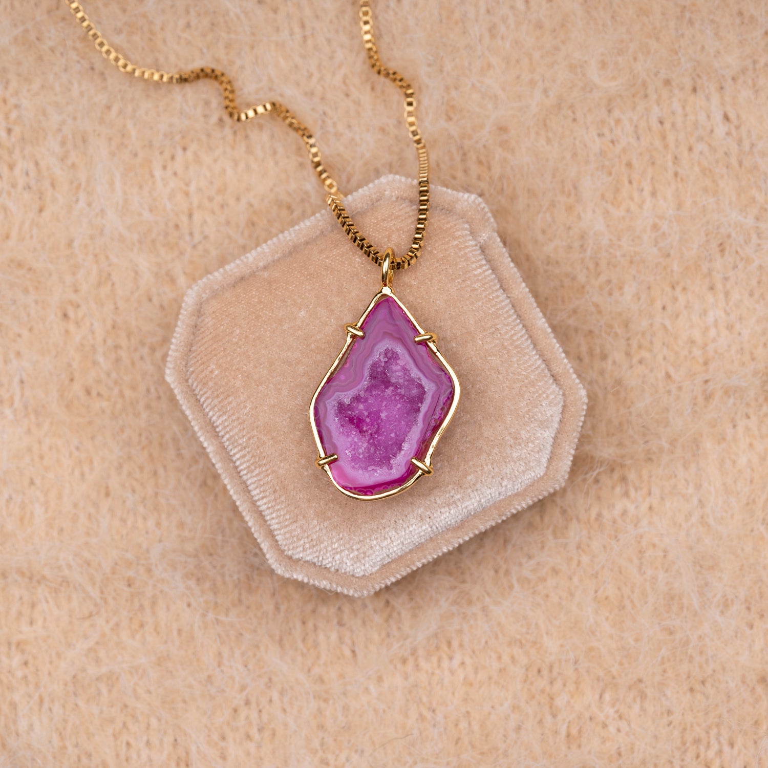 Iedere geode hanger is one-of-a-kind door haar natuurlijke vorm en unieke patronen. Geen twee stenen zijn hetzelfde, waardoor je een sieraad draagt dat écht alleen van jou is. Omdat iedere steen uniek is, is er van elk sieraad maar één beschikbaar — uitverkocht is dus ook écht uitverkocht.
