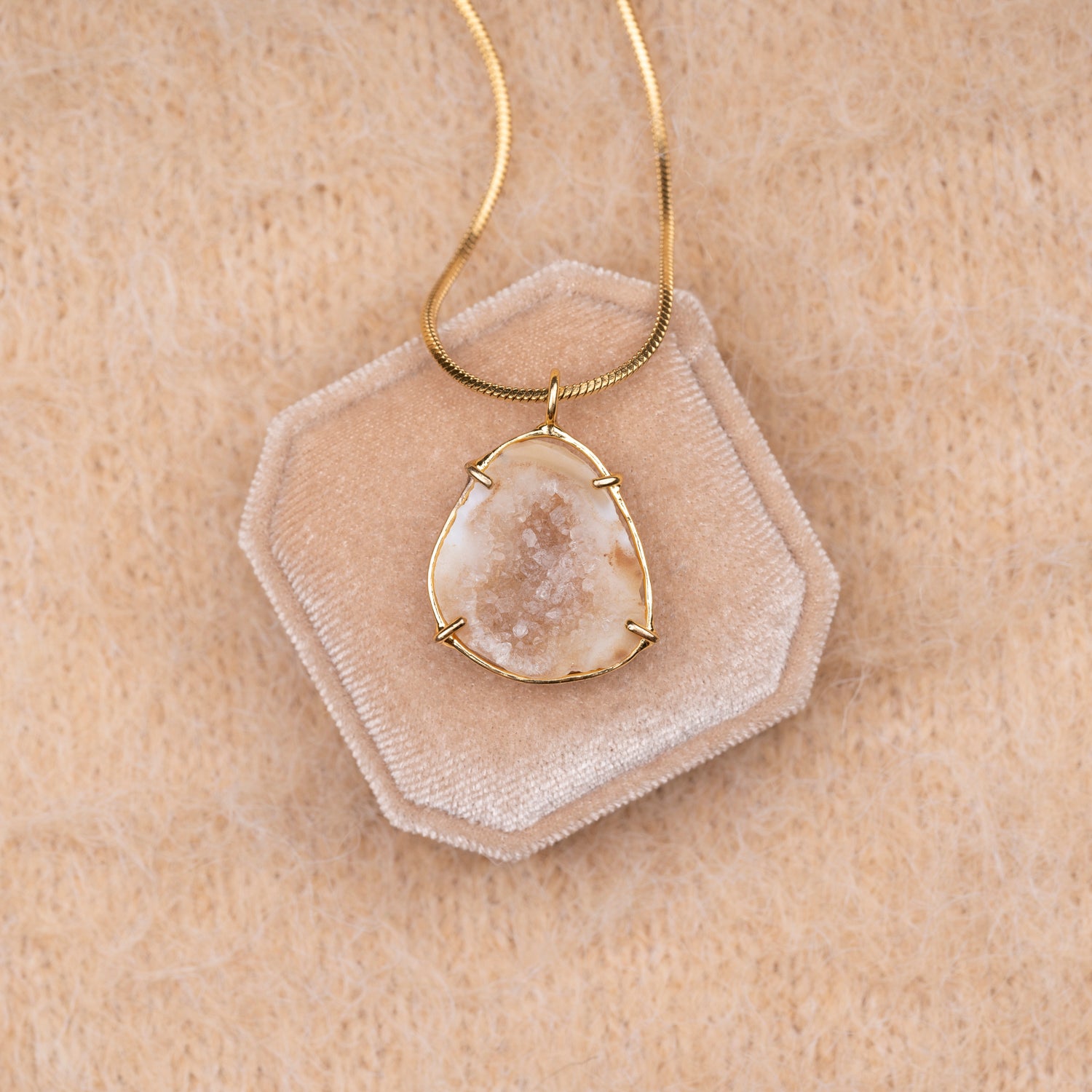 Iedere geode hanger is one-of-a-kind door haar natuurlijke vorm en unieke patronen. Geen twee stenen zijn hetzelfde, waardoor je een sieraad draagt dat écht alleen van jou is. Omdat iedere steen uniek is, is er van elk sieraad maar één beschikbaar — uitverkocht is dus ook écht uitverkocht.
