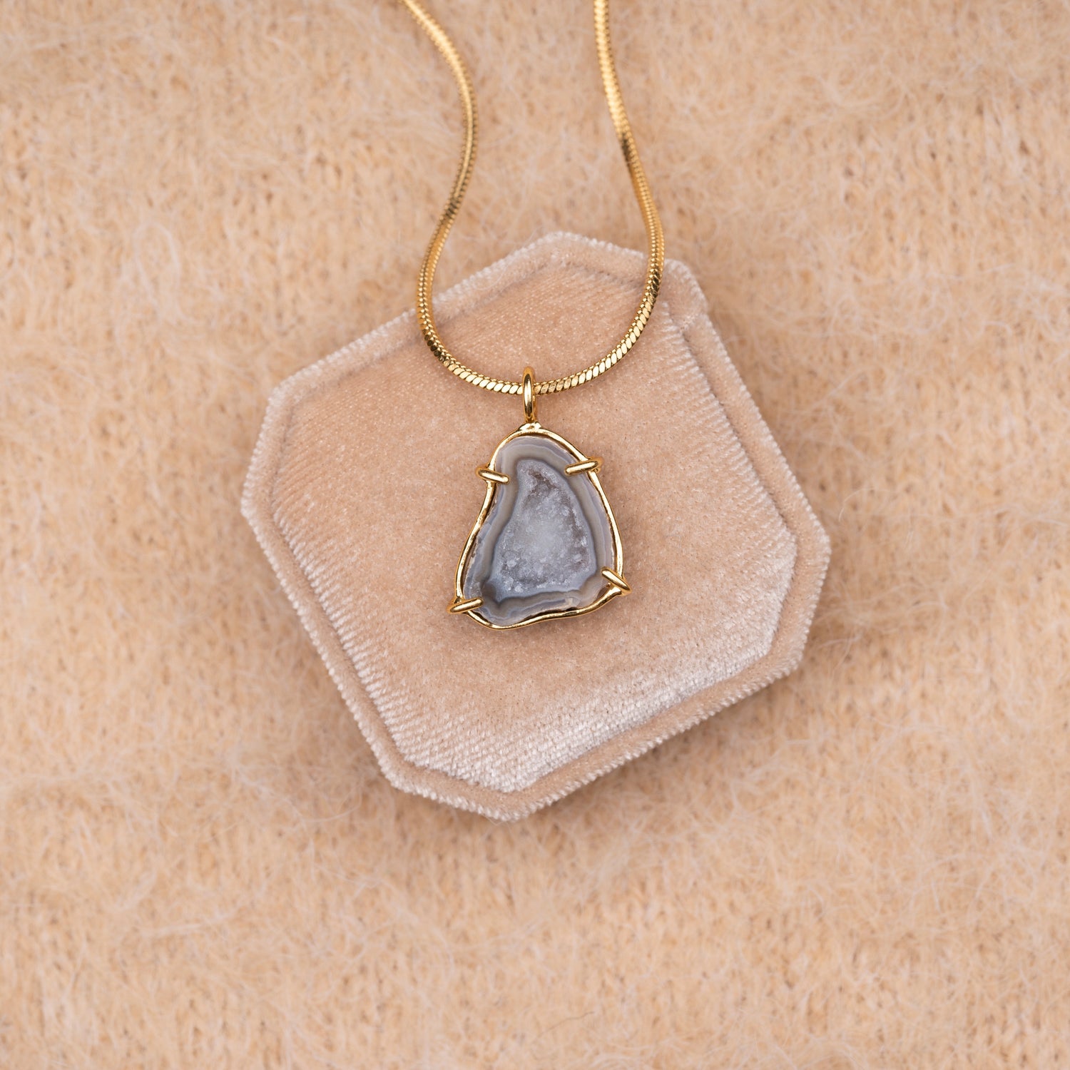 Iedere geode hanger is one-of-a-kind door haar natuurlijke vorm en unieke patronen. Geen twee stenen zijn hetzelfde, waardoor je een sieraad draagt dat écht alleen van jou is. Omdat iedere steen uniek is, is er van elk sieraad maar één beschikbaar — uitverkocht is dus ook écht uitverkocht.