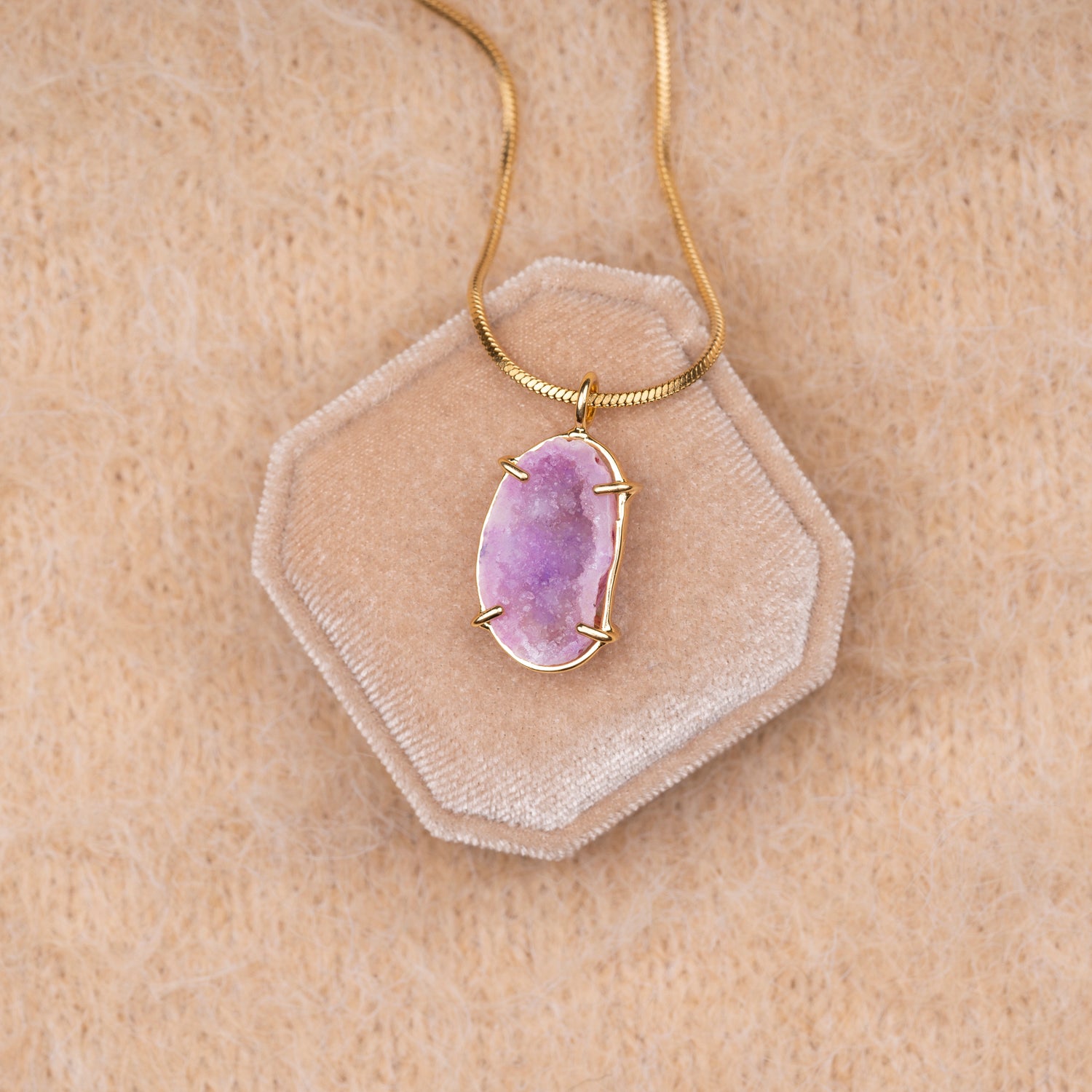 Iedere geode hanger is one-of-a-kind door haar natuurlijke vorm en unieke patronen. Geen twee stenen zijn hetzelfde, waardoor je een sieraad draagt dat écht alleen van jou is. Omdat iedere steen uniek is, is er van elk sieraad maar één beschikbaar — uitverkocht is dus ook écht uitverkocht.