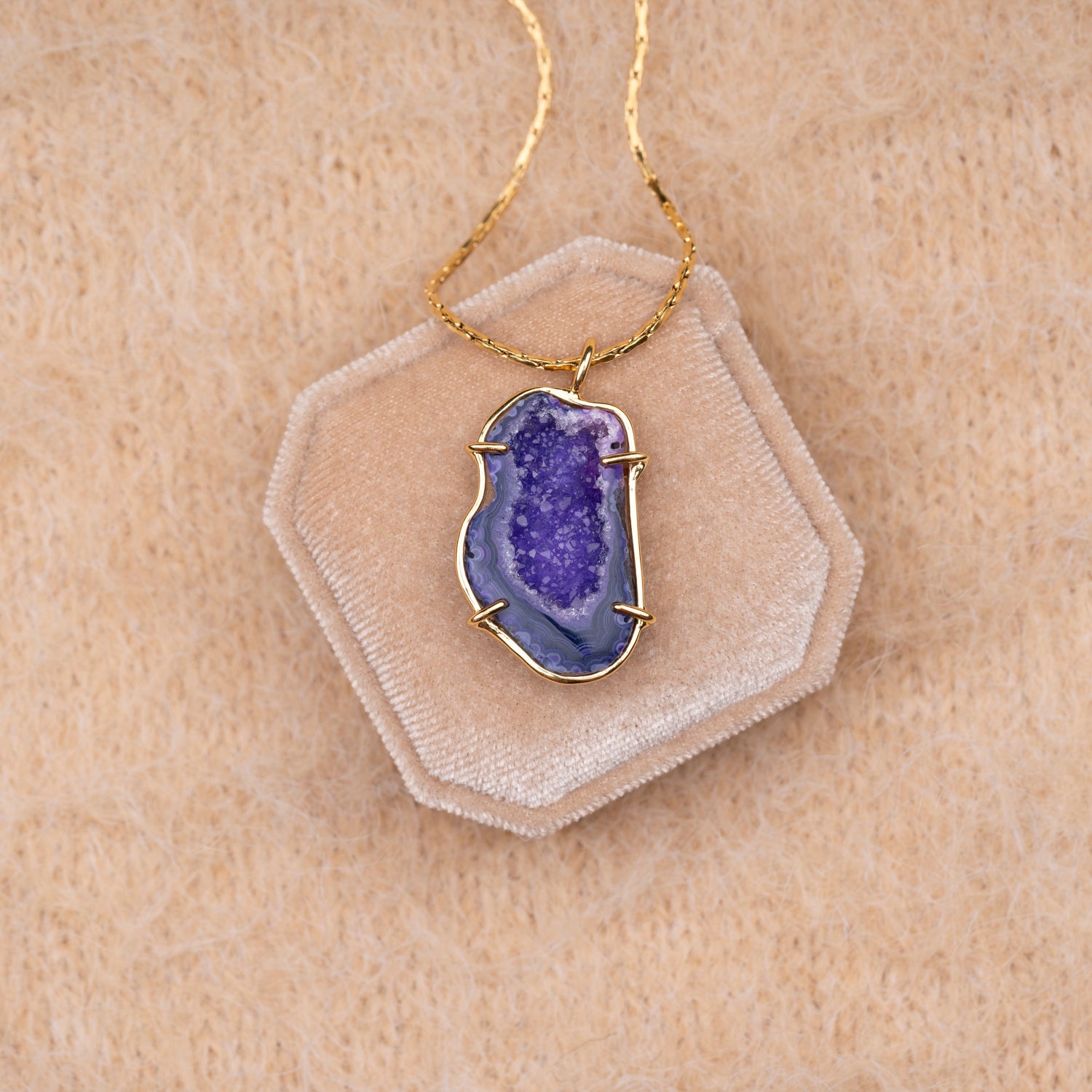 Iedere geode hanger is one-of-a-kind door haar natuurlijke vorm en unieke patronen. Geen twee stenen zijn hetzelfde, waardoor je een sieraad draagt dat écht alleen van jou is. Omdat iedere steen uniek is, is er van elk sieraad maar één beschikbaar — uitverkocht is dus ook écht uitverkocht.