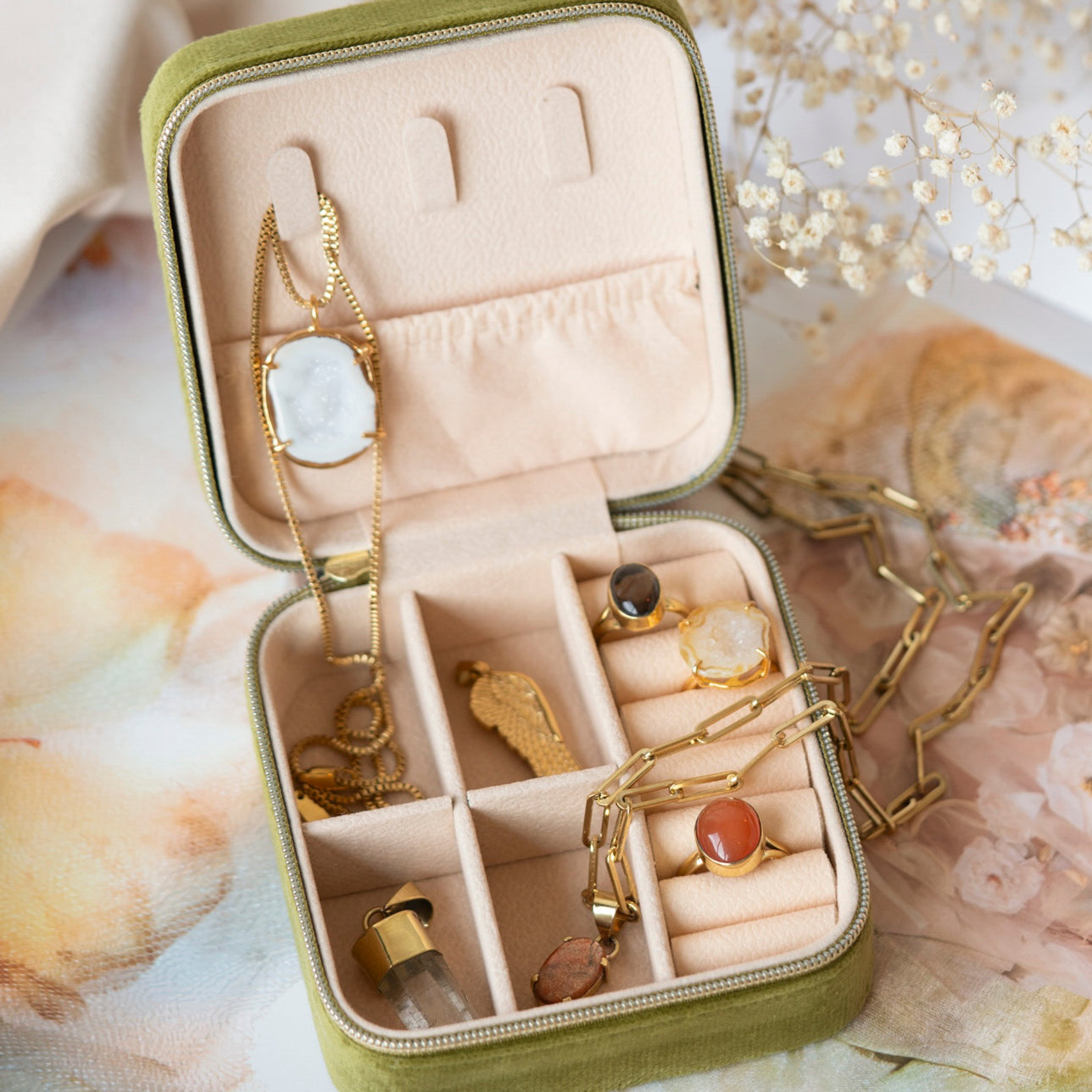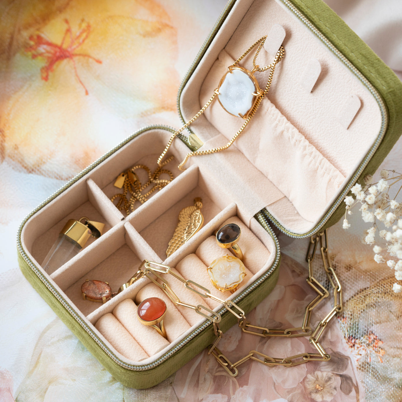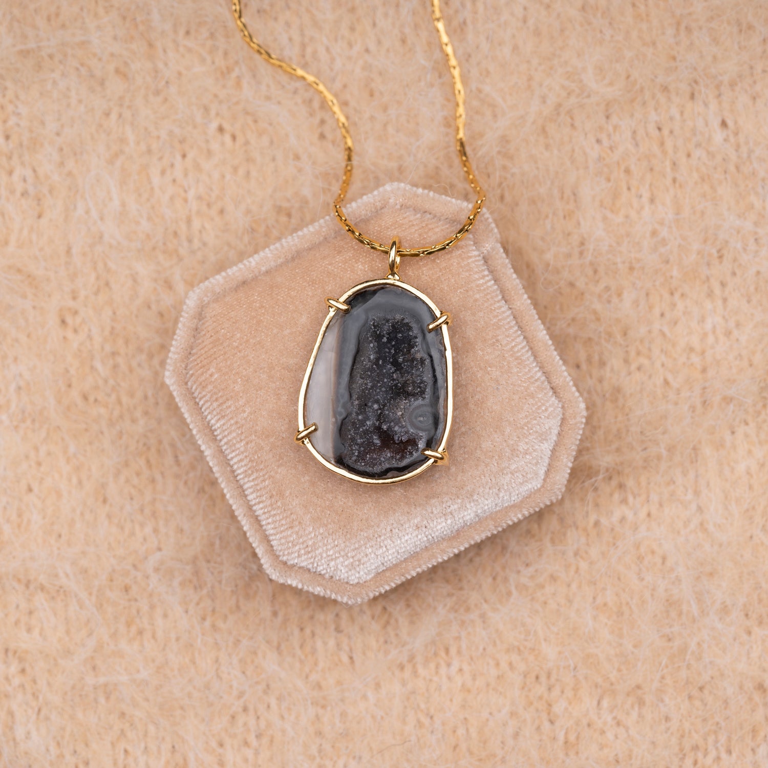 Iedere geode hanger is one-of-a-kind door haar natuurlijke vorm en unieke patronen. Geen twee stenen zijn hetzelfde, waardoor je een sieraad draagt dat écht alleen van jou is. Omdat iedere steen uniek is, is er van elk sieraad maar één beschikbaar — uitverkocht is dus ook écht uitverkocht.
