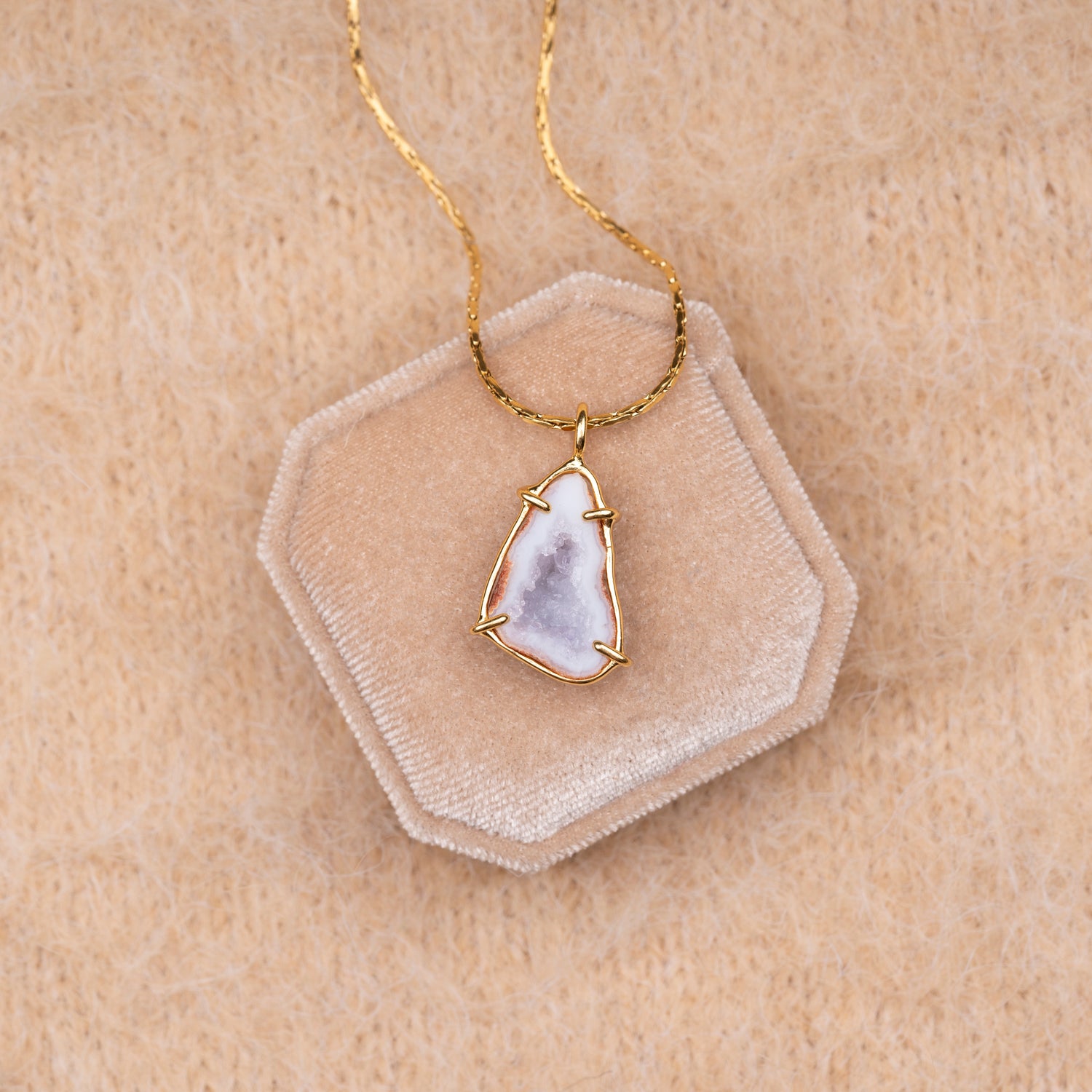 Iedere geode hanger is one-of-a-kind door haar natuurlijke vorm en unieke patronen. Geen twee stenen zijn hetzelfde, waardoor je een sieraad draagt dat écht alleen van jou is. Omdat iedere steen uniek is, is er van elk sieraad maar één beschikbaar — uitverkocht is dus ook écht uitverkocht.