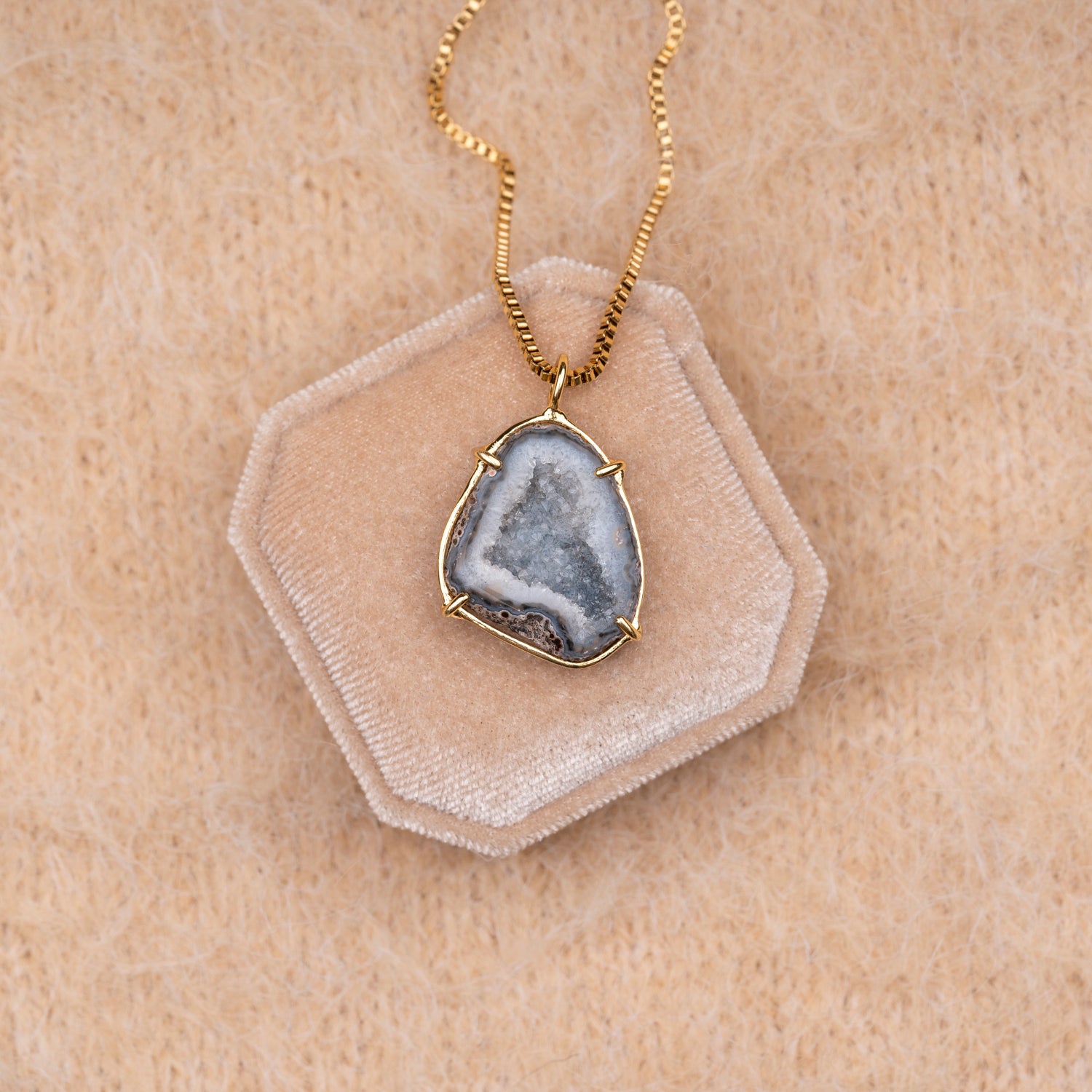 Iedere geode hanger is one-of-a-kind door haar natuurlijke vorm en unieke patronen. Geen twee stenen zijn hetzelfde, waardoor je een sieraad draagt dat écht alleen van jou is. Omdat iedere steen uniek is, is er van elk sieraad maar één beschikbaar — uitverkocht is dus ook écht uitverkocht.