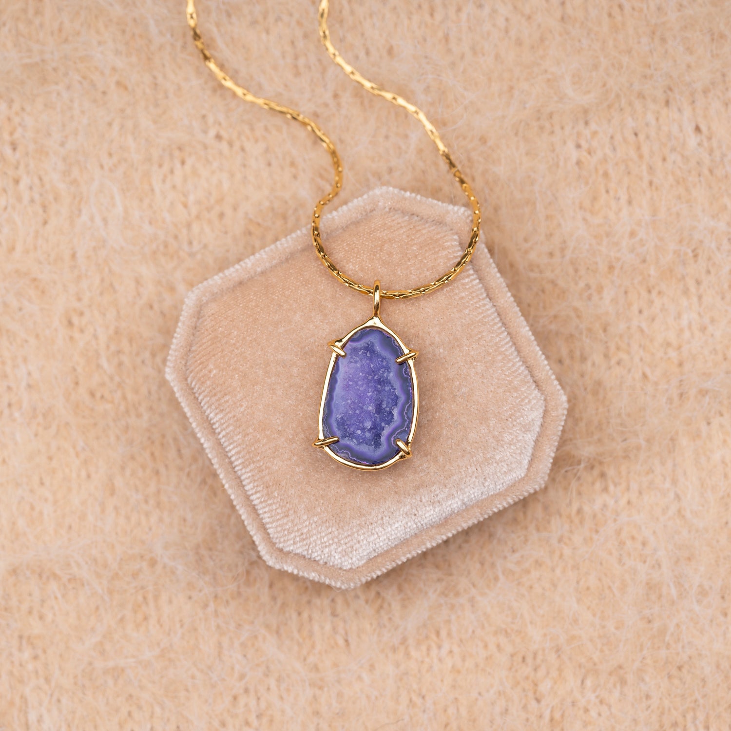 Iedere geode hanger is one-of-a-kind door haar natuurlijke vorm en unieke patronen. Geen twee stenen zijn hetzelfde, waardoor je een sieraad draagt dat écht alleen van jou is. Omdat iedere steen uniek is, is er van elk sieraad maar één beschikbaar — uitverkocht is dus ook écht uitverkocht.