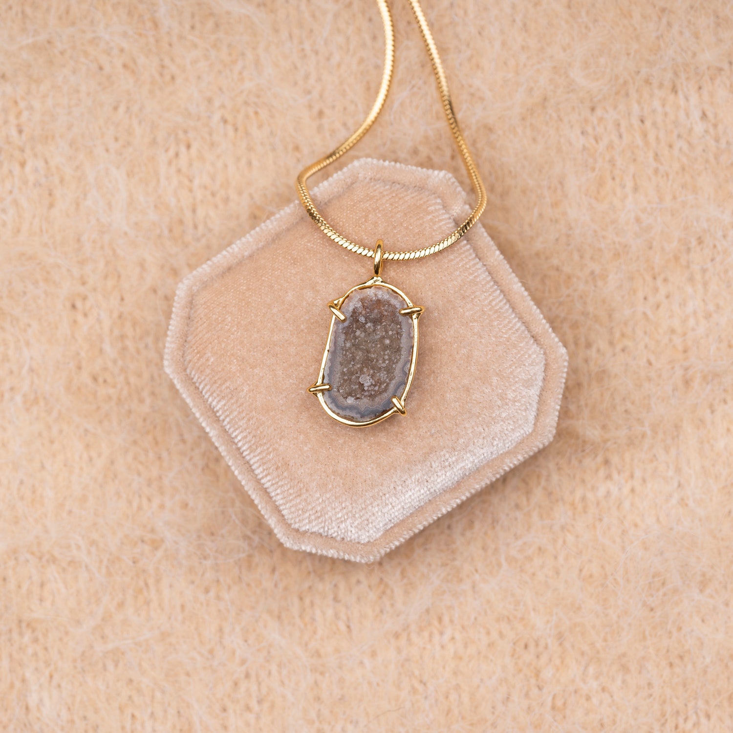 Iedere geode hanger is one-of-a-kind door haar natuurlijke vorm en unieke patronen. Geen twee stenen zijn hetzelfde, waardoor je een sieraad draagt dat écht alleen van jou is. Omdat iedere steen uniek is, is er van elk sieraad maar één beschikbaar — uitverkocht is dus ook écht uitverkocht.