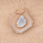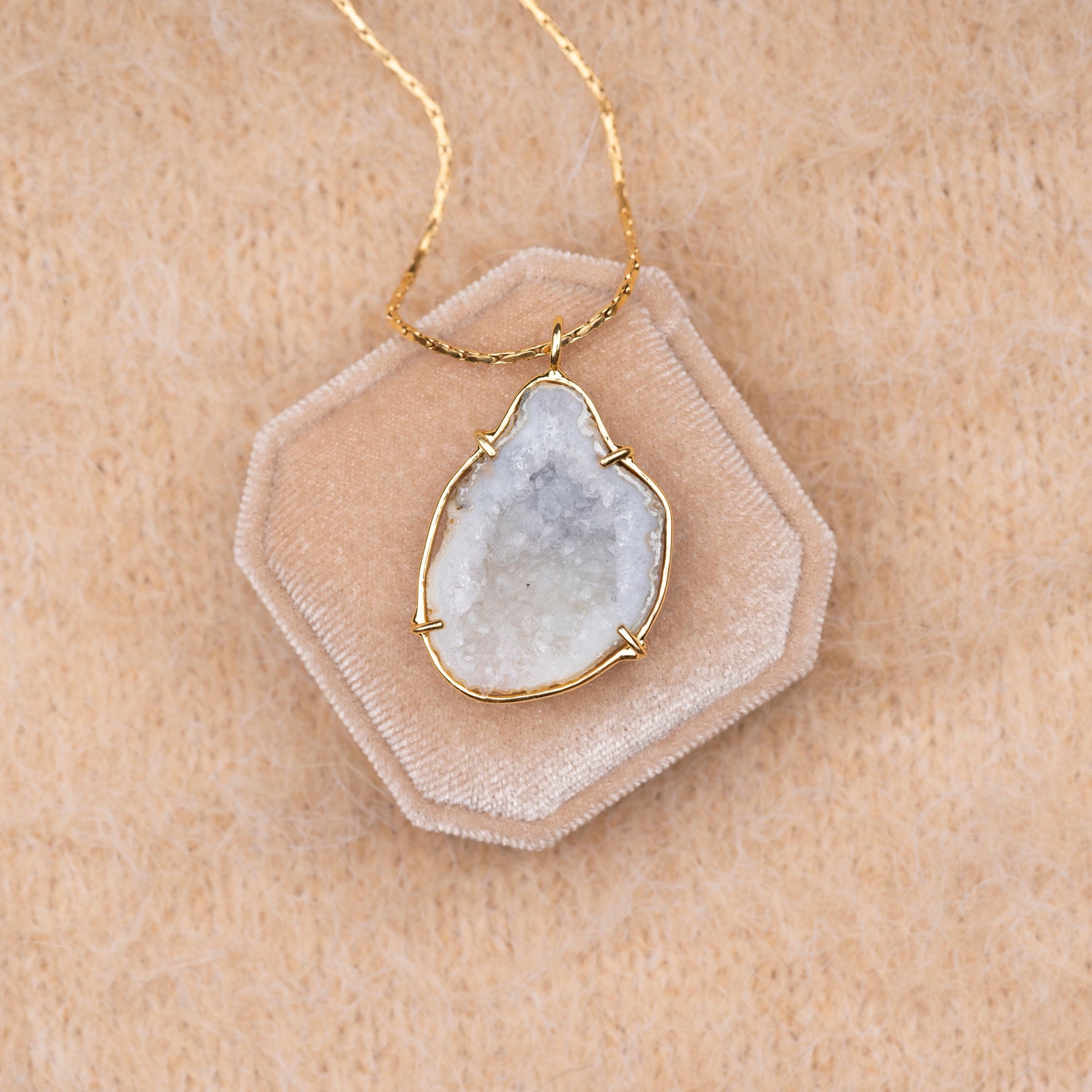 Iedere geode hanger is one-of-a-kind door haar natuurlijke vorm en unieke patronen. Geen twee stenen zijn hetzelfde, waardoor je een sieraad draagt dat écht alleen van jou is. Omdat iedere steen uniek is, is er van elk sieraad maar één beschikbaar — uitverkocht is dus ook écht uitverkocht.