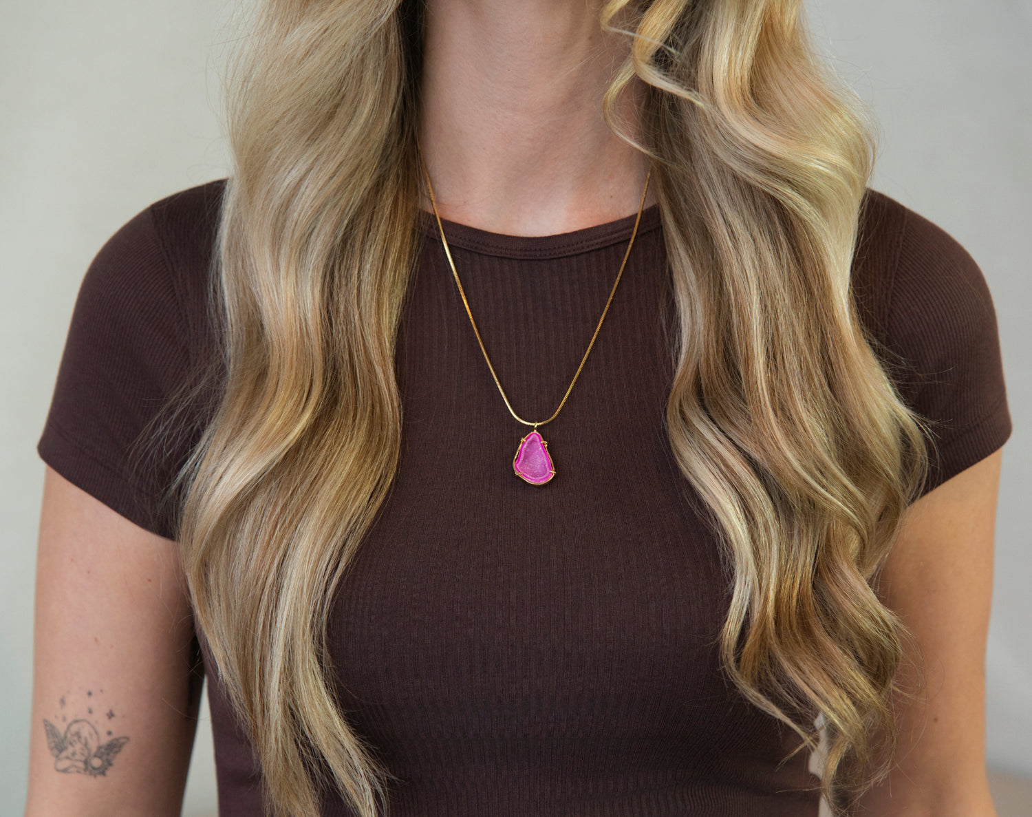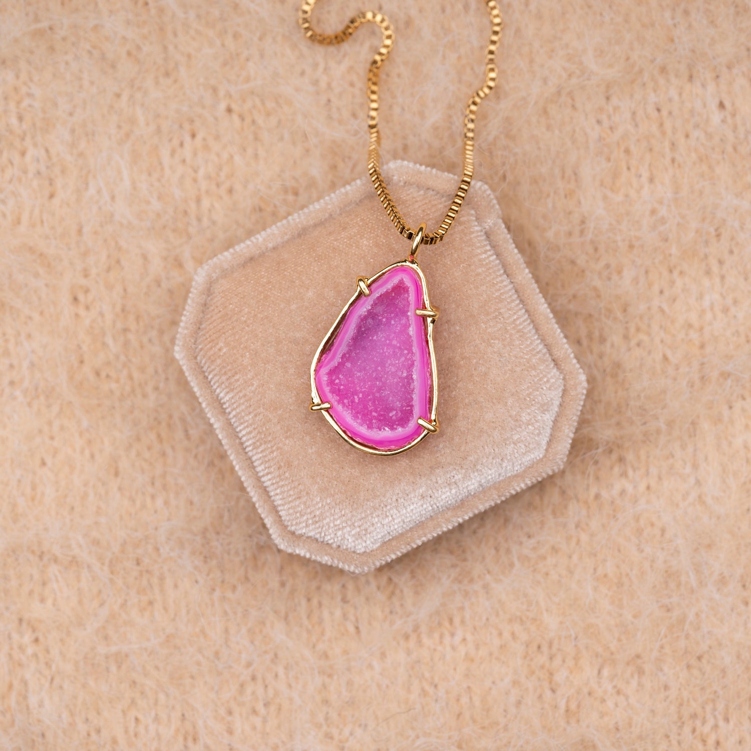 Iedere geode hanger is one-of-a-kind door haar natuurlijke vorm en unieke patronen. Geen twee stenen zijn hetzelfde, waardoor je een sieraad draagt dat écht alleen van jou is. Omdat iedere steen uniek is, is er van elk sieraad maar één beschikbaar — uitverkocht is dus ook écht uitverkocht.