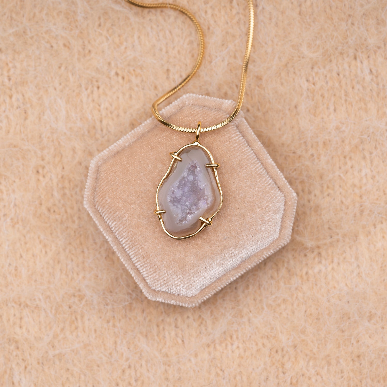 Iedere geode hanger is one-of-a-kind door haar natuurlijke vorm en unieke patronen. Geen twee stenen zijn hetzelfde, waardoor je een sieraad draagt dat écht alleen van jou is. Omdat iedere steen uniek is, is er van elk sieraad maar één beschikbaar — uitverkocht is dus ook écht uitverkocht.
