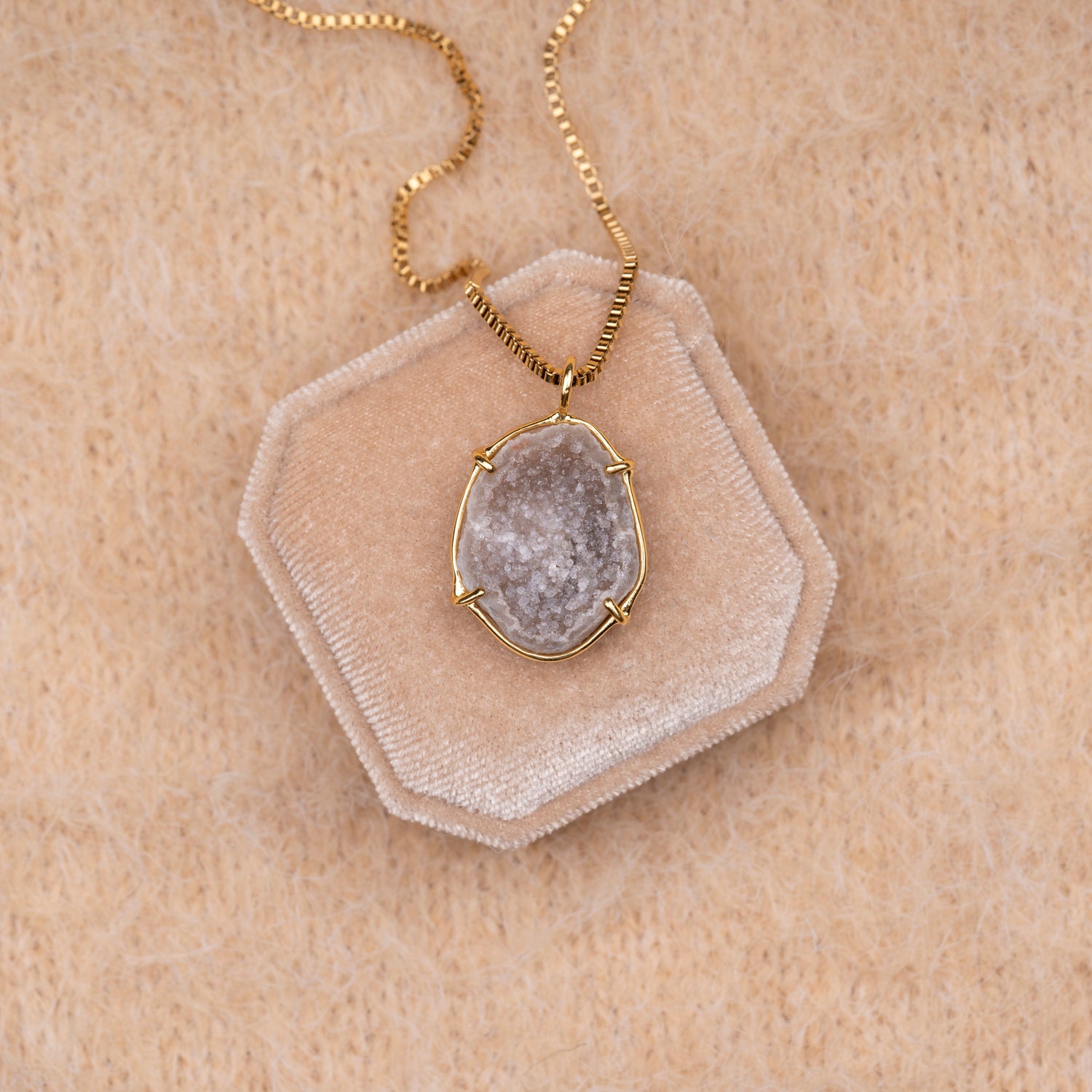 Iedere geode hanger is one-of-a-kind door haar natuurlijke vorm en unieke patronen. Geen twee stenen zijn hetzelfde, waardoor je een sieraad draagt dat écht alleen van jou is. Omdat iedere steen uniek is, is er van elk sieraad maar één beschikbaar — uitverkocht is dus ook écht uitverkocht.