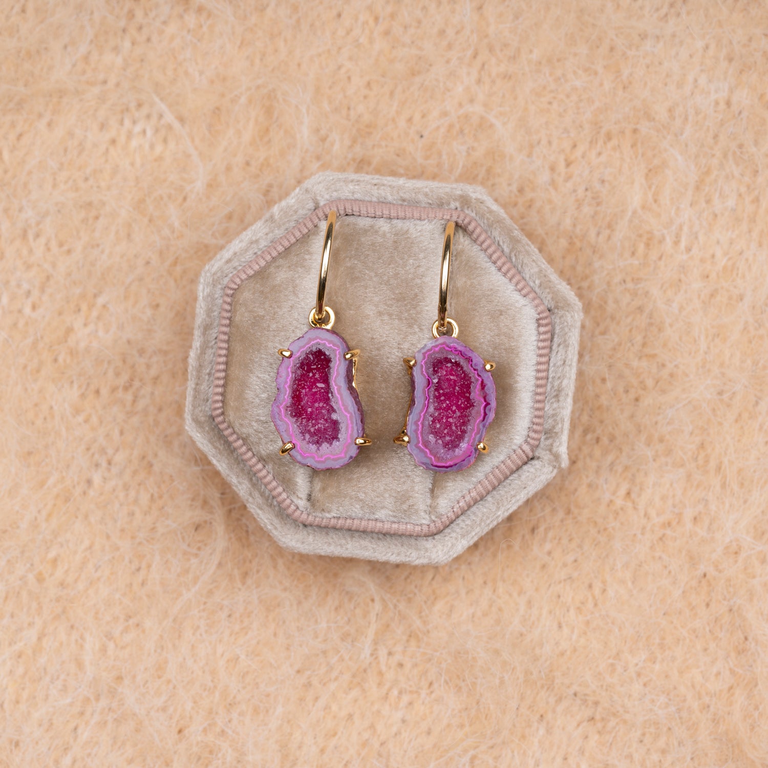 Onze geode oorbellen zijn one-of-a-kind door hun natuurlijke vormen en unieke patronen. Geen twee paren zijn hetzelfde, waardoor je een sieraad draagt dat écht alleen van jou is. Omdat iedere steen uniek is, is er van elk sieraad maar één beschikbaar — uitverkocht is dus ook écht uitverkocht.
