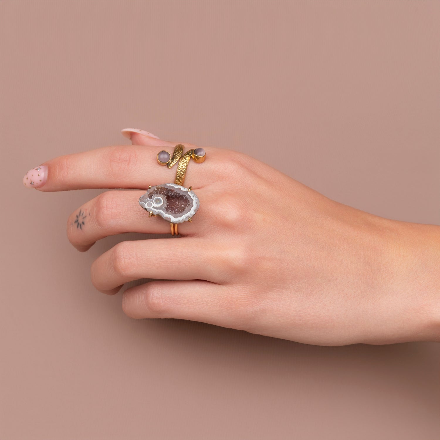 Iedere geode ring is one-of-a-kind door haar natuurlijke vorm en unieke patronen. Geen twee stenen zijn hetzelfde, waardoor je een sieraad draagt dat écht alleen van jou is. Omdat iedere steen uniek is, is er van elk sieraad maar één beschikbaar — uitverkocht is dus ook écht uitverkocht.