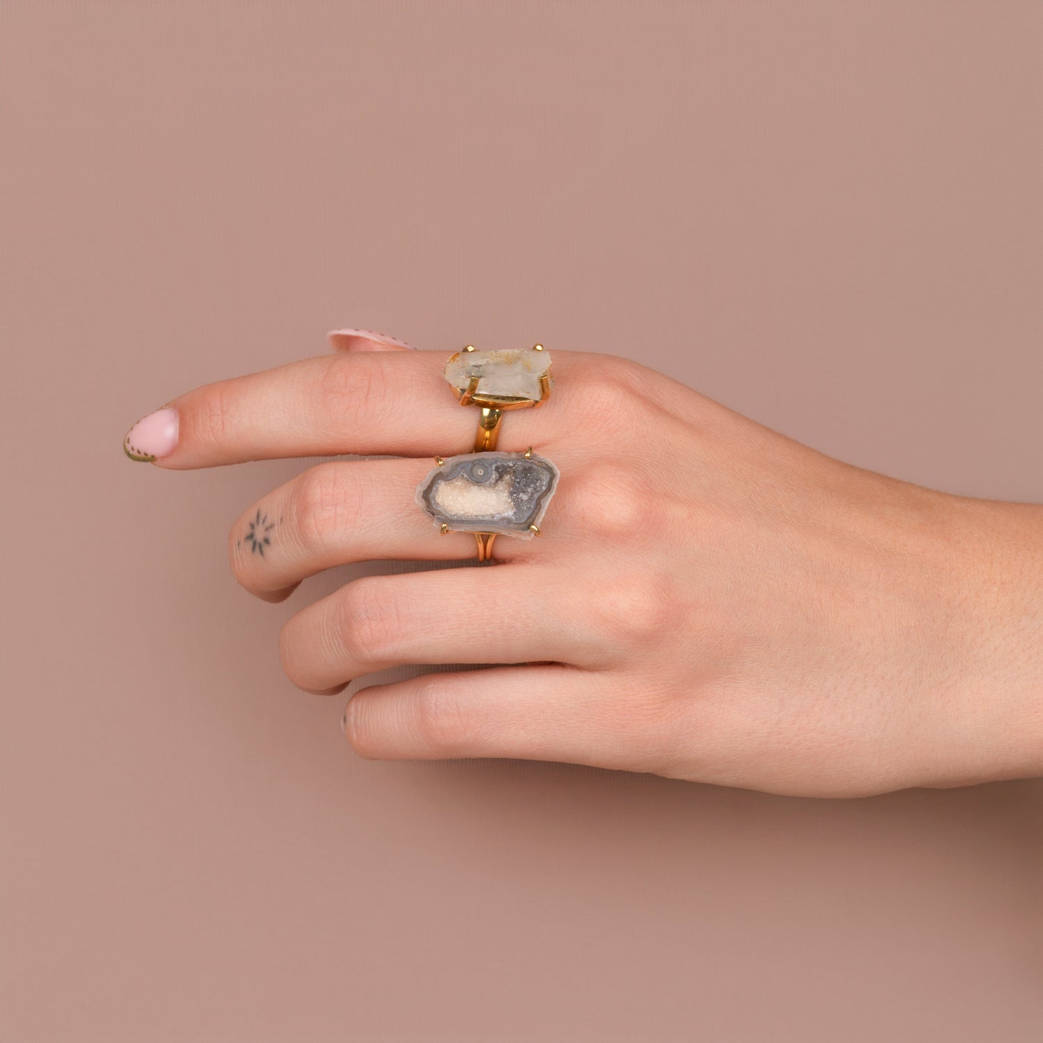 Iedere geode ring is one-of-a-kind door haar natuurlijke vorm en unieke patronen. Geen twee stenen zijn hetzelfde, waardoor je een sieraad draagt dat écht alleen van jou is. Omdat iedere steen uniek is, is er van elk sieraad maar één beschikbaar — uitverkocht is dus ook écht uitverkocht.