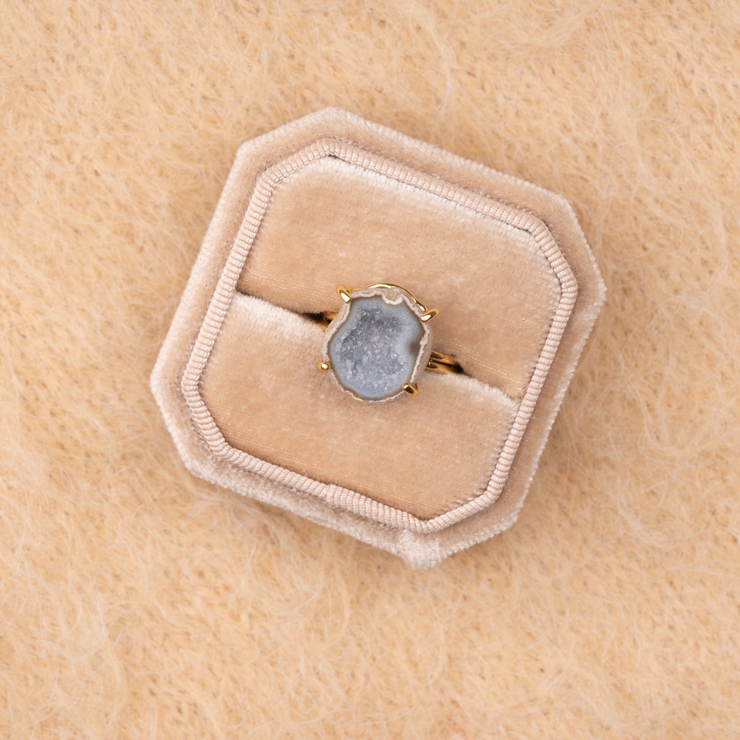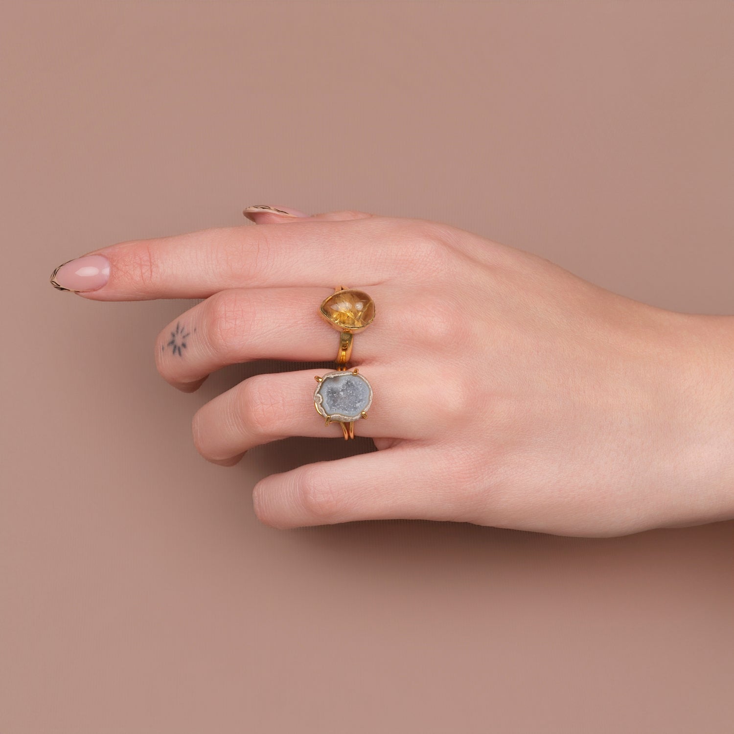 Iedere geode ring is one-of-a-kind door haar natuurlijke vorm en unieke patronen. Geen twee stenen zijn hetzelfde, waardoor je een sieraad draagt dat écht alleen van jou is. Omdat iedere steen uniek is, is er van elk sieraad maar één beschikbaar — uitverkocht is dus ook écht uitverkocht.