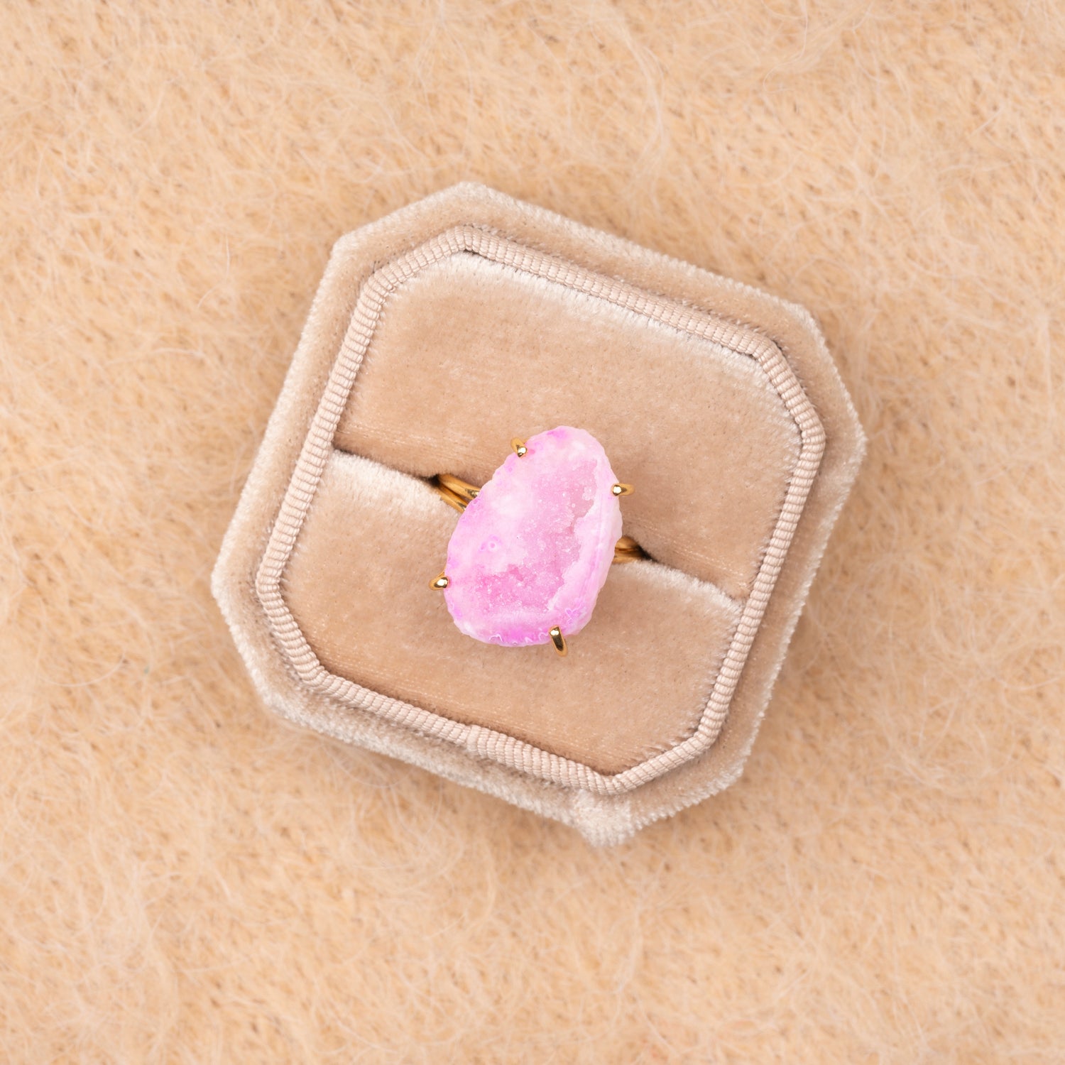Iedere geode ring is one-of-a-kind door haar natuurlijke vorm en unieke patronen. Geen twee stenen zijn hetzelfde, waardoor je een sieraad draagt dat écht alleen van jou is. Omdat iedere steen uniek is, is er van elk sieraad maar één beschikbaar — uitverkocht is dus ook écht uitverkocht.
