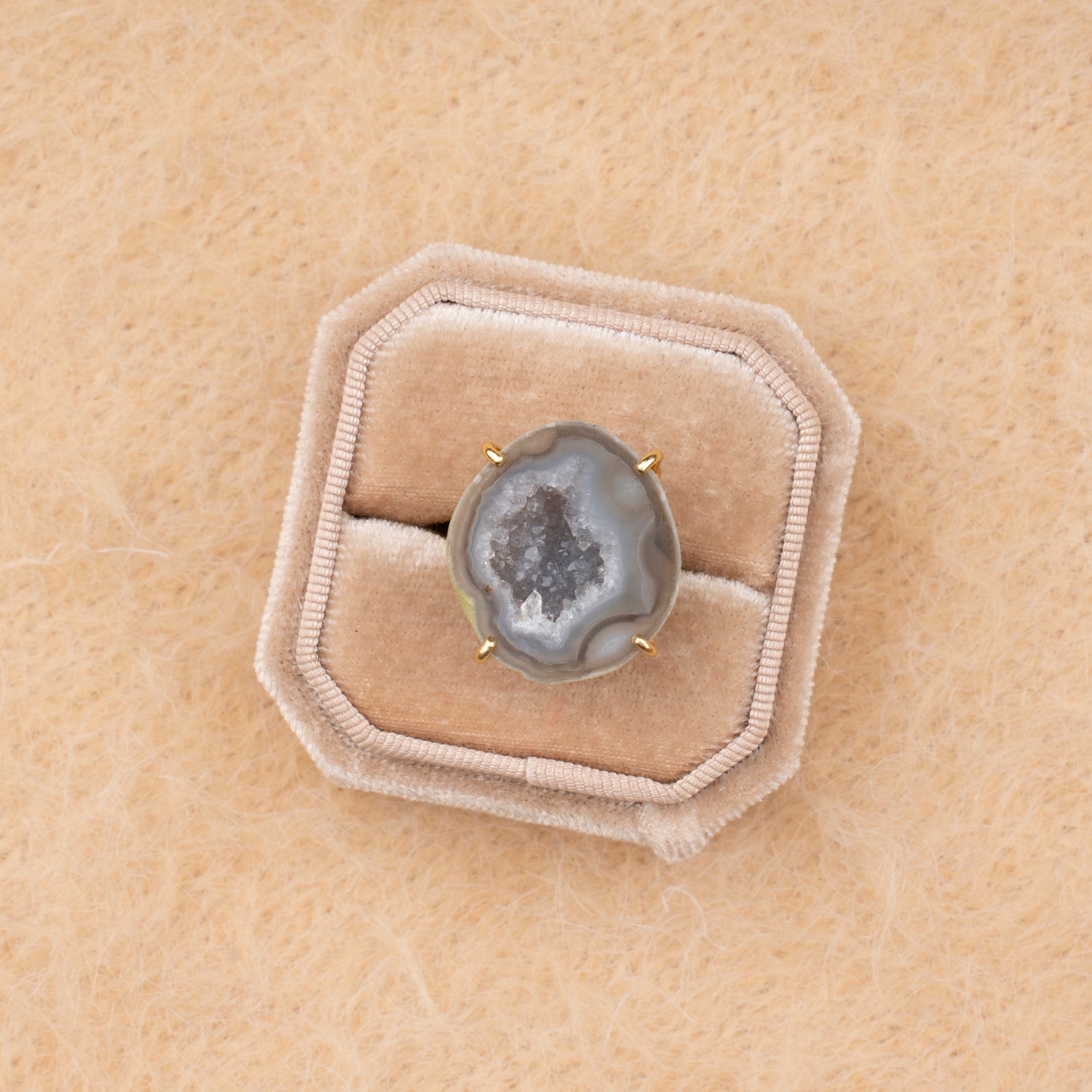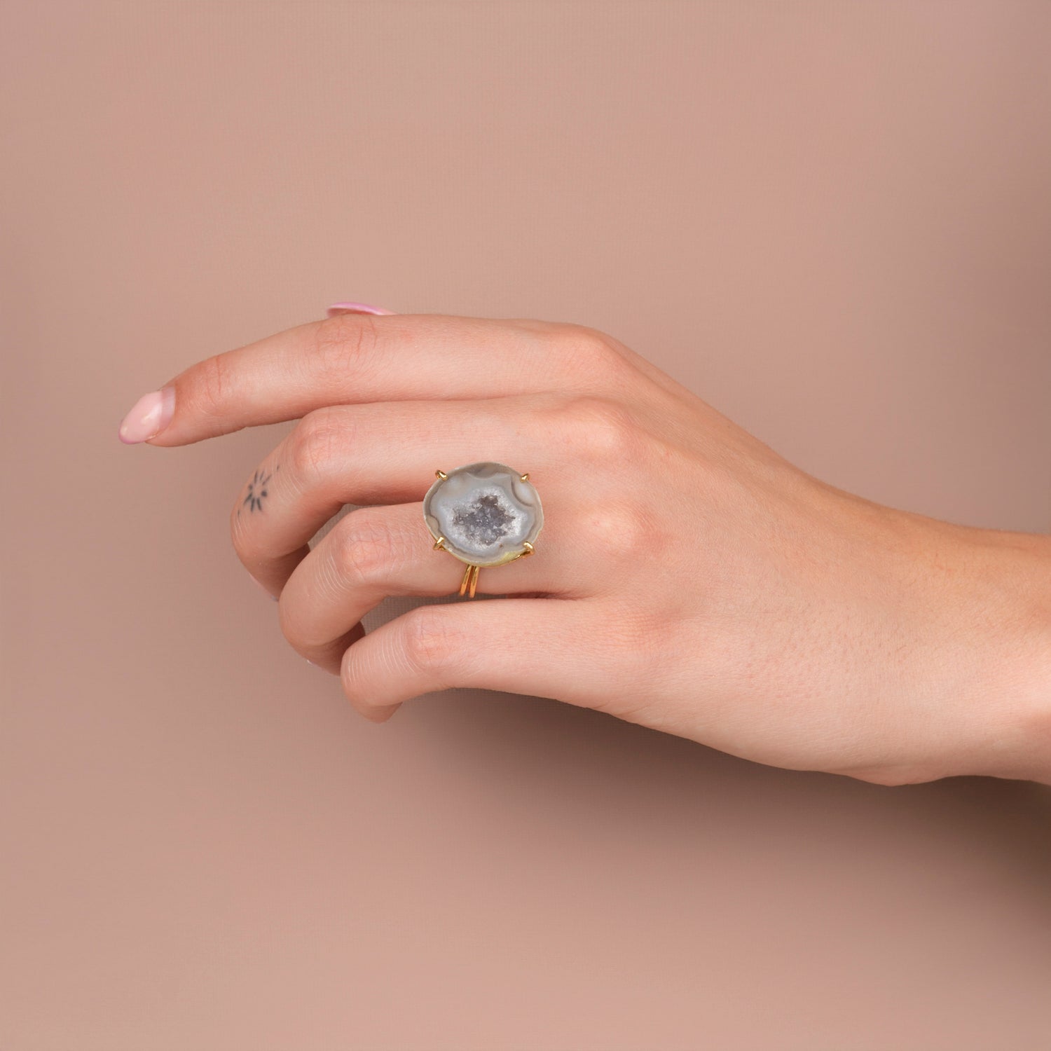Iedere geode ring is one-of-a-kind door haar natuurlijke vorm en unieke patronen. Geen twee stenen zijn hetzelfde, waardoor je een sieraad draagt dat écht alleen van jou is. Omdat iedere steen uniek is, is er van elk sieraad maar één beschikbaar — uitverkocht is dus ook écht uitverkocht.