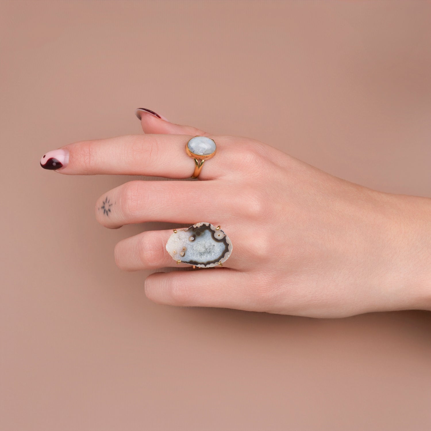 Iedere geode ring is one-of-a-kind door haar natuurlijke vorm en unieke patronen. Geen twee stenen zijn hetzelfde, waardoor je een sieraad draagt dat écht alleen van jou is. Omdat iedere steen uniek is, is er van elk sieraad maar één beschikbaar — uitverkocht is dus ook écht uitverkocht.
