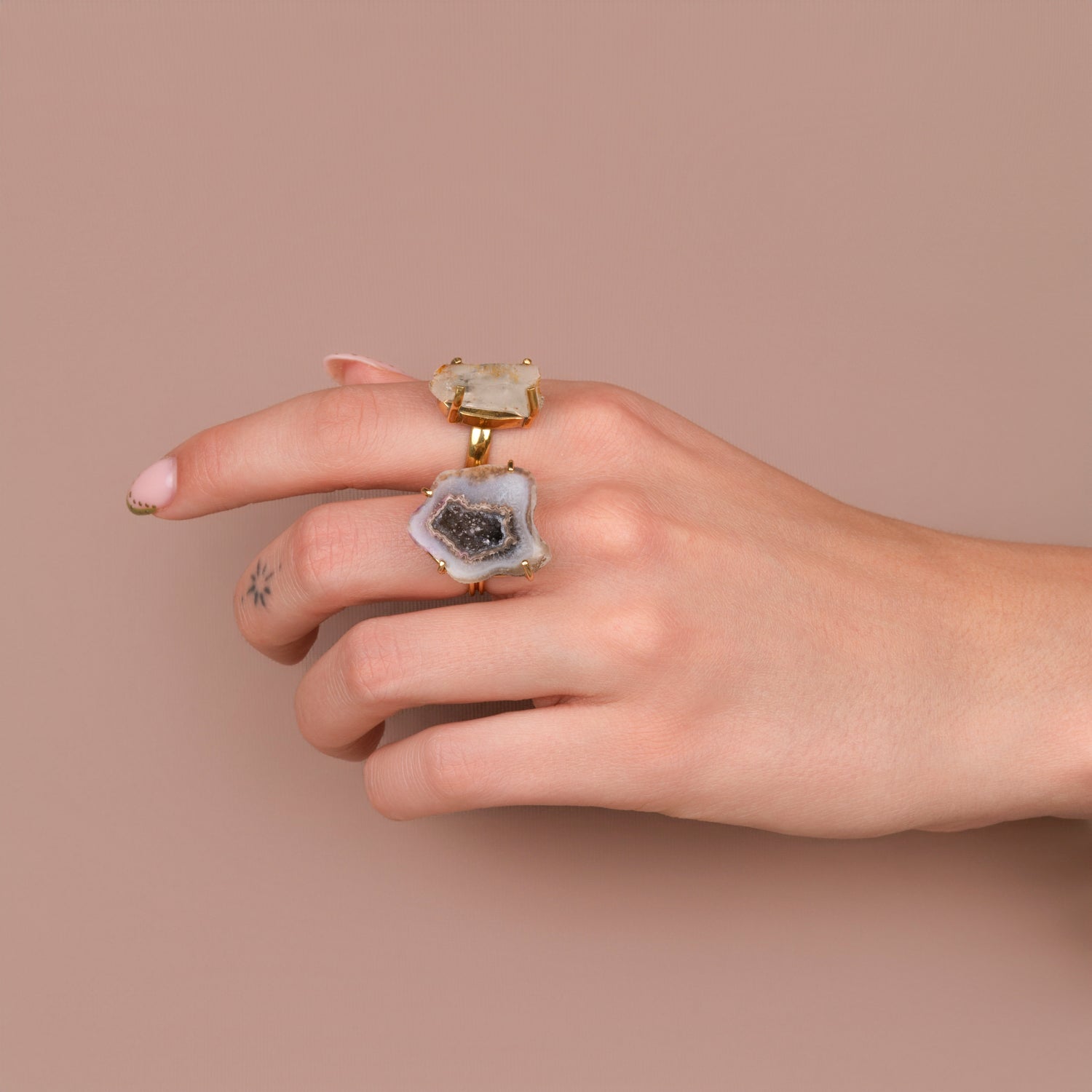 Iedere geode ring is one-of-a-kind door haar natuurlijke vorm en unieke patronen. Geen twee stenen zijn hetzelfde, waardoor je een sieraad draagt dat écht alleen van jou is. Omdat iedere steen uniek is, is er van elk sieraad maar één beschikbaar — uitverkocht is dus ook écht uitverkocht.