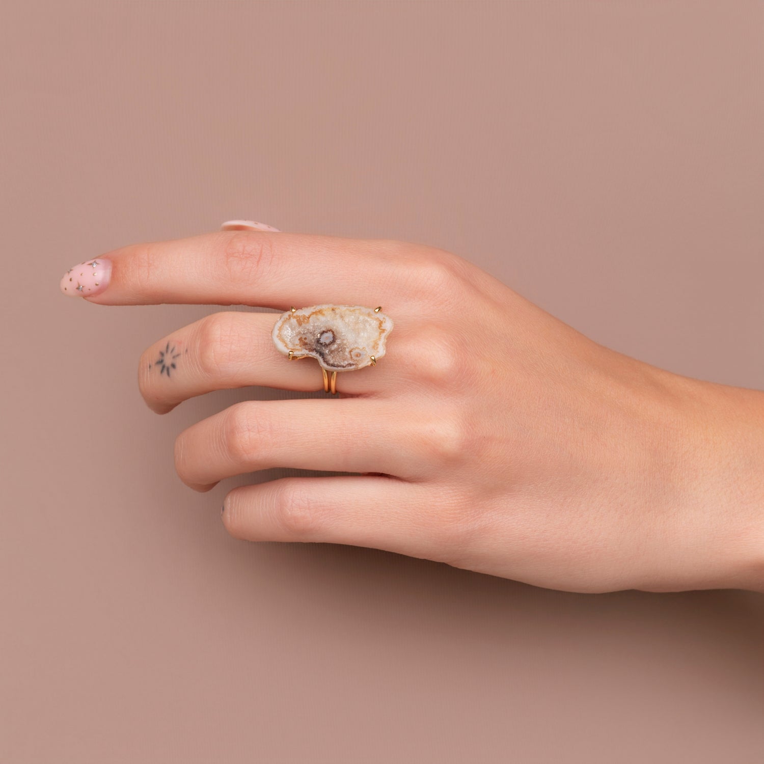 Iedere geode ring is one-of-a-kind door haar natuurlijke vorm en unieke patronen. Geen twee stenen zijn hetzelfde, waardoor je een sieraad draagt dat écht alleen van jou is. Omdat iedere steen uniek is, is er van elk sieraad maar één beschikbaar — uitverkocht is dus ook écht uitverkocht.