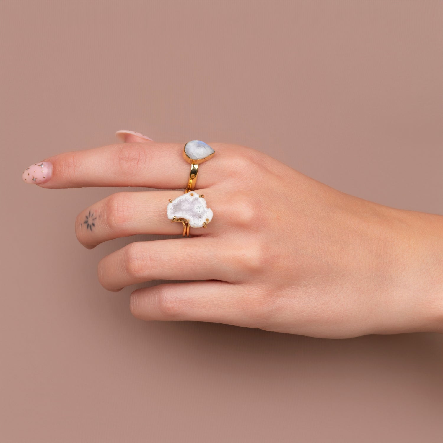 Iedere geode ring is one-of-a-kind door haar natuurlijke vorm en unieke patronen. Geen twee stenen zijn hetzelfde, waardoor je een sieraad draagt dat écht alleen van jou is. Omdat iedere steen uniek is, is er van elk sieraad maar één beschikbaar — uitverkocht is dus ook écht uitverkocht.