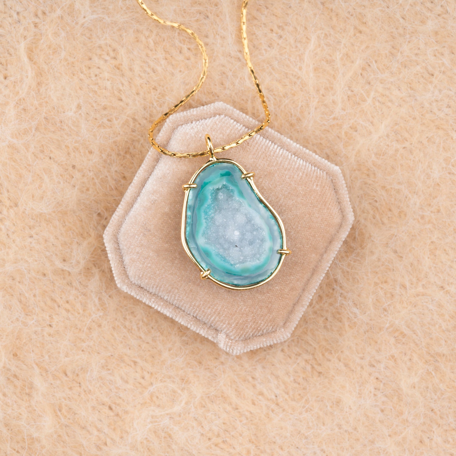 Iedere geode hanger is one-of-a-kind door haar natuurlijke vorm en unieke patronen. Geen twee stenen zijn hetzelfde, waardoor je een sieraad draagt dat écht alleen van jou is. Omdat iedere steen uniek is, is er van elk sieraad maar één beschikbaar — uitverkocht is dus ook écht uitverkocht.