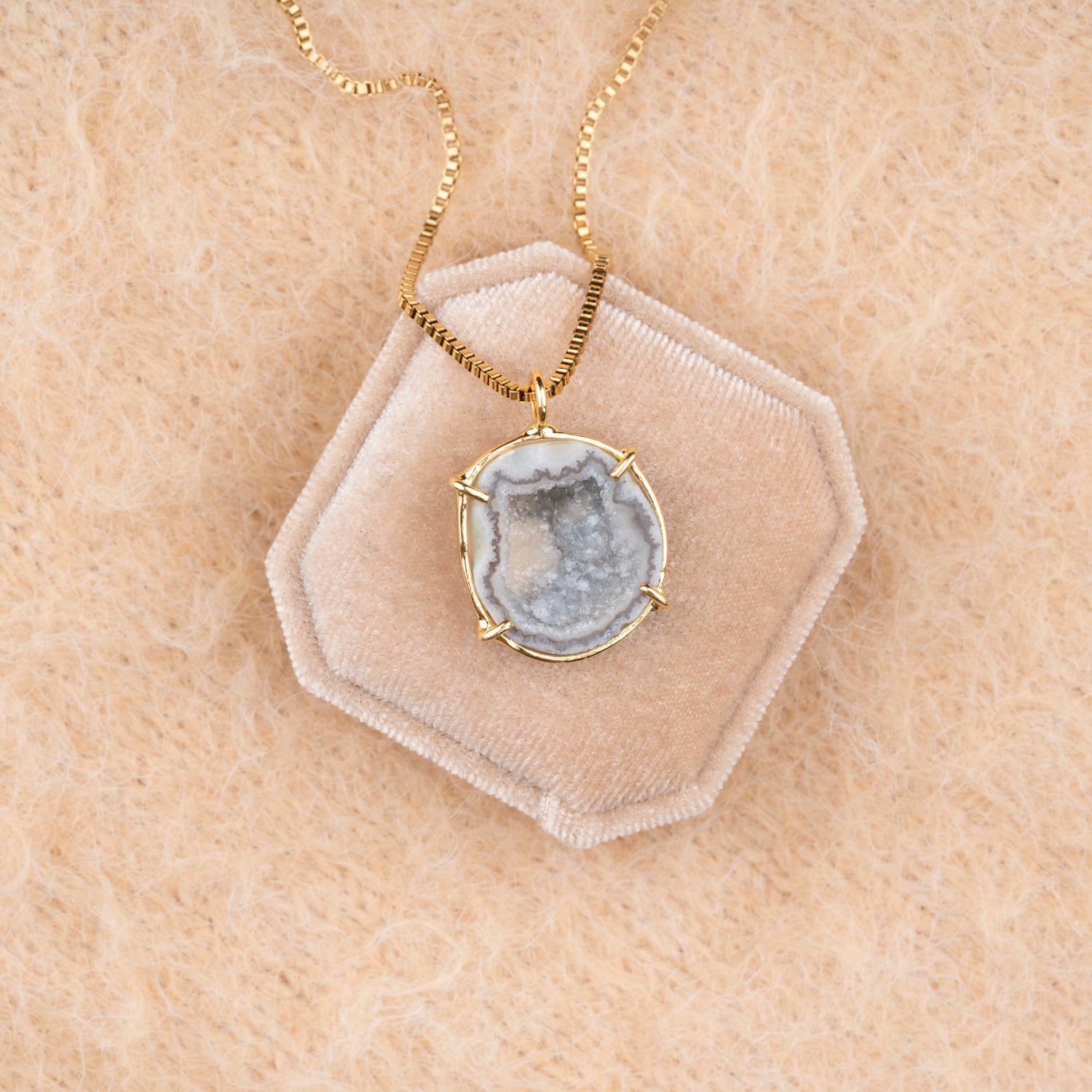 Iedere geode hanger is one-of-a-kind door haar natuurlijke vorm en unieke patronen. Geen twee stenen zijn hetzelfde, waardoor je een sieraad draagt dat écht alleen van jou is. Omdat iedere steen uniek is, is er van elk sieraad maar één beschikbaar — uitverkocht is dus ook écht uitverkocht.