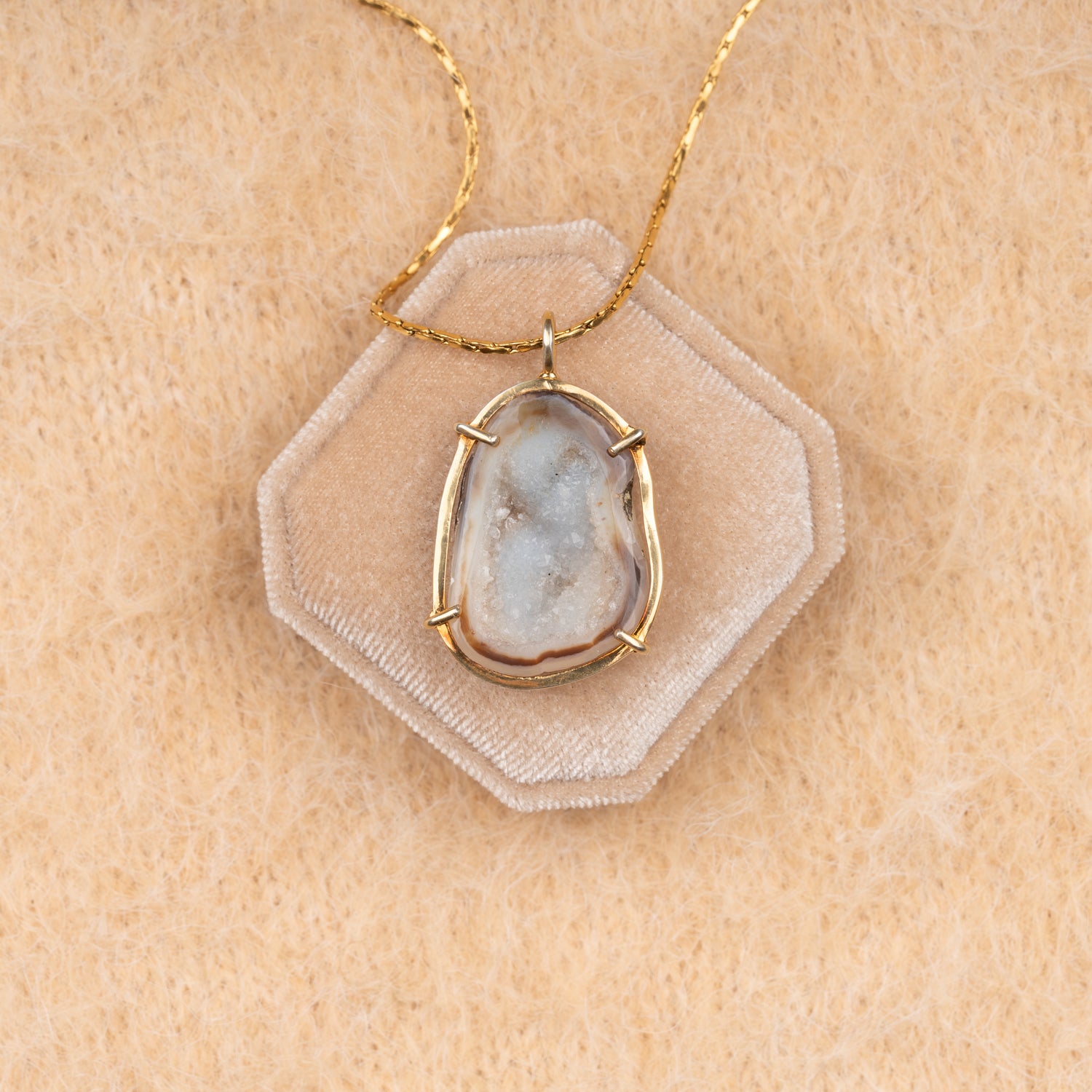 Iedere geode hanger is one-of-a-kind door haar natuurlijke vorm en unieke patronen. Geen twee stenen zijn hetzelfde, waardoor je een sieraad draagt dat écht alleen van jou is. Omdat iedere steen uniek is, is er van elk sieraad maar één beschikbaar — uitverkocht is dus ook écht uitverkocht.