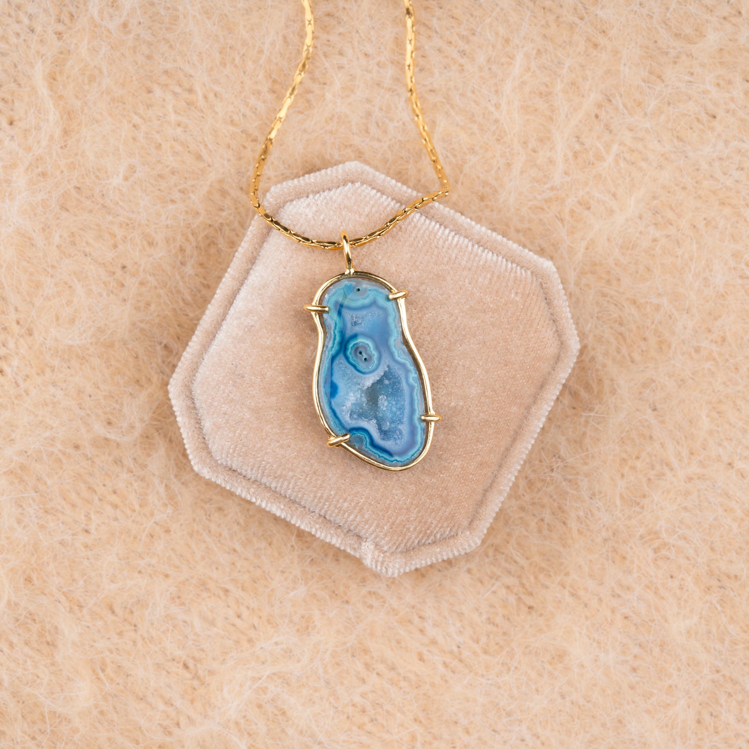 Iedere geode hanger is one-of-a-kind door haar natuurlijke vorm en unieke patronen. Geen twee stenen zijn hetzelfde, waardoor je een sieraad draagt dat écht alleen van jou is. Omdat iedere steen uniek is, is er van elk sieraad maar één beschikbaar — uitverkocht is dus ook écht uitverkocht.