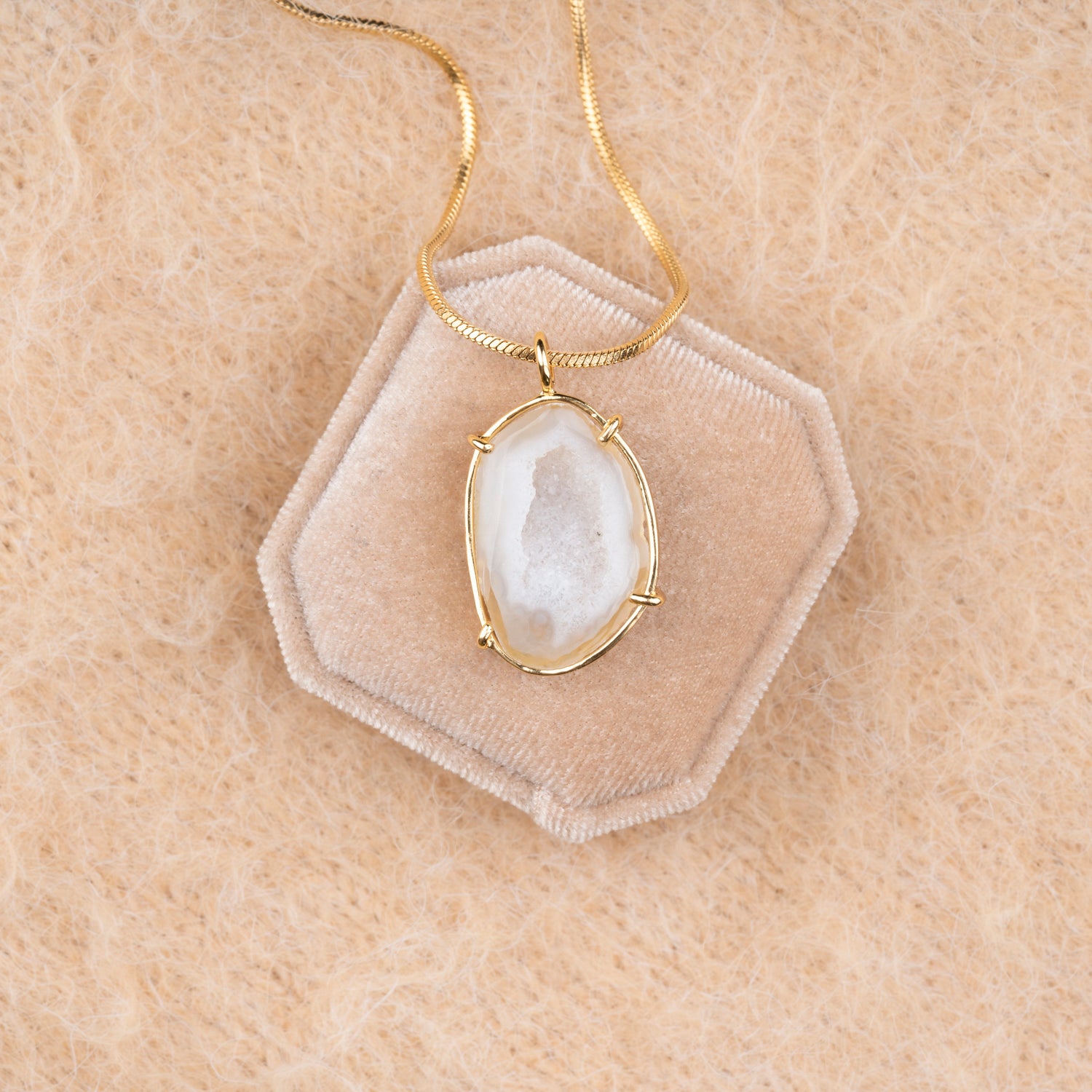 Iedere geode hanger is one-of-a-kind door haar natuurlijke vorm en unieke patronen. Geen twee stenen zijn hetzelfde, waardoor je een sieraad draagt dat écht alleen van jou is. Omdat iedere steen uniek is, is er van elk sieraad maar één beschikbaar — uitverkocht is dus ook écht uitverkocht.