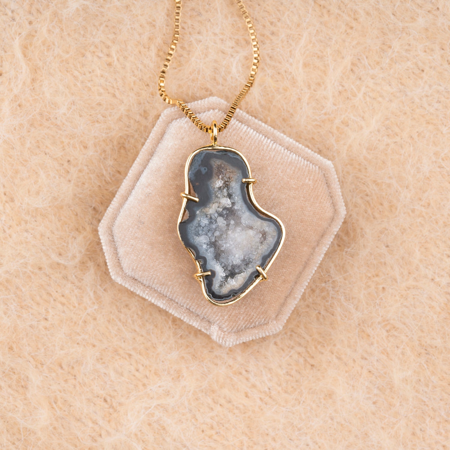 Iedere geode hanger is one-of-a-kind door haar natuurlijke vorm en unieke patronen. Geen twee stenen zijn hetzelfde, waardoor je een sieraad draagt dat écht alleen van jou is. Omdat iedere steen uniek is, is er van elk sieraad maar één beschikbaar — uitverkocht is dus ook écht uitverkocht.