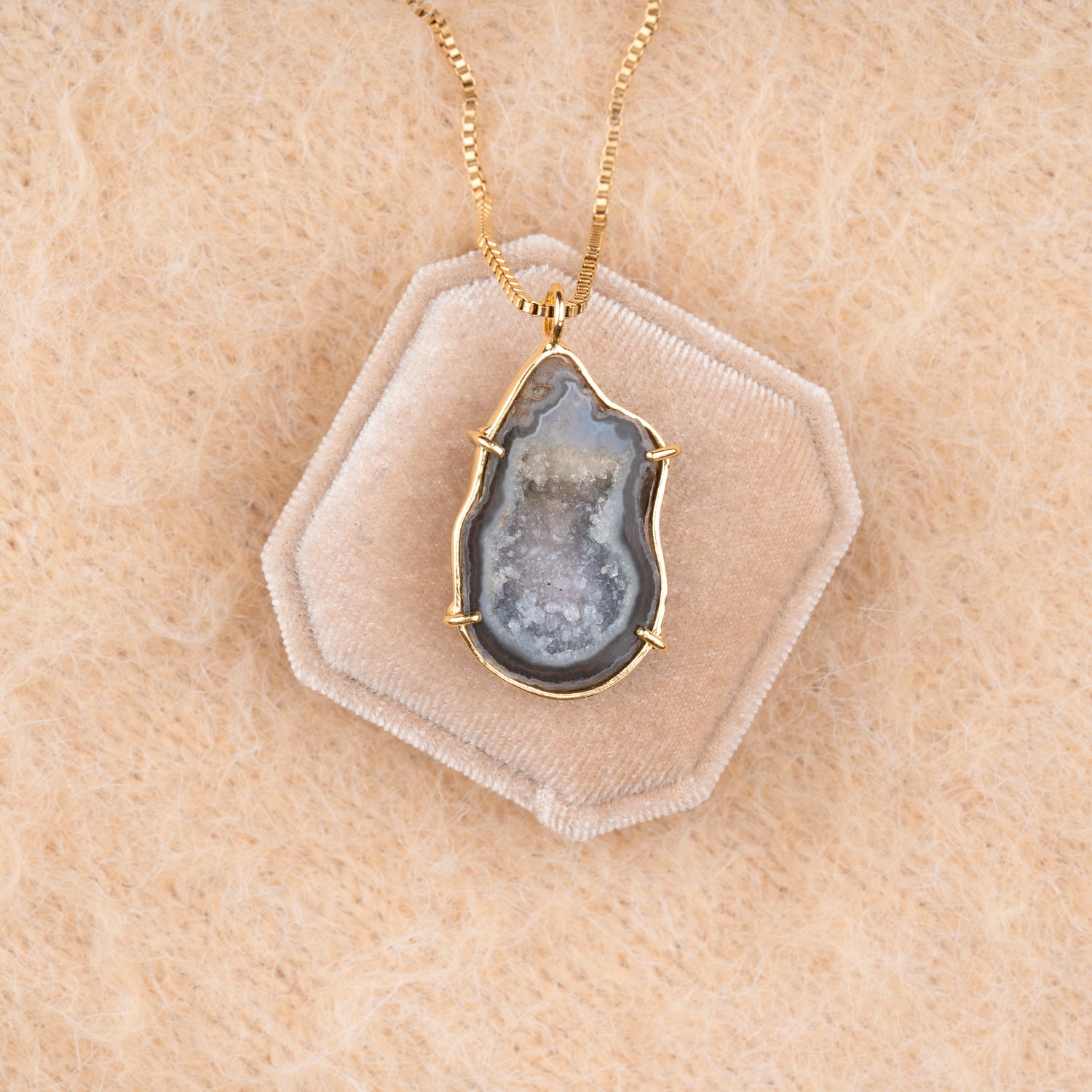 Iedere geode hanger is one-of-a-kind door haar natuurlijke vorm en unieke patronen. Geen twee stenen zijn hetzelfde, waardoor je een sieraad draagt dat écht alleen van jou is. Omdat iedere steen uniek is, is er van elk sieraad maar één beschikbaar — uitverkocht is dus ook écht uitverkocht.
