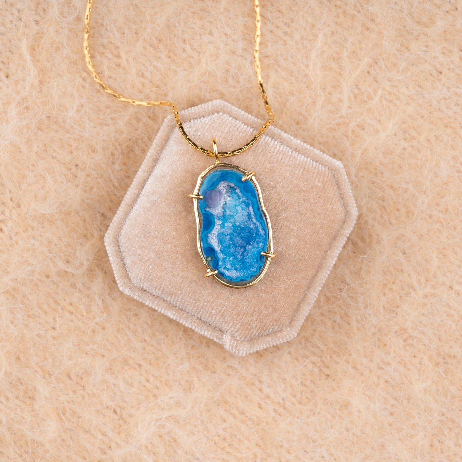 Iedere geode hanger is one-of-a-kind door haar natuurlijke vorm en unieke patronen. Geen twee stenen zijn hetzelfde, waardoor je een sieraad draagt dat écht alleen van jou is. Omdat iedere steen uniek is, is er van elk sieraad maar één beschikbaar — uitverkocht is dus ook écht uitverkocht.