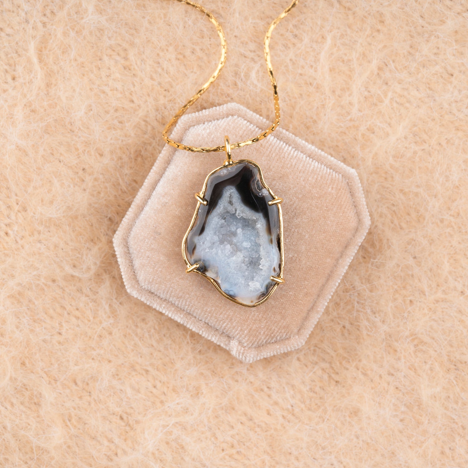 Iedere geode hanger is one-of-a-kind door haar natuurlijke vorm en unieke patronen. Geen twee stenen zijn hetzelfde, waardoor je een sieraad draagt dat écht alleen van jou is. Omdat iedere steen uniek is, is er van elk sieraad maar één beschikbaar — uitverkocht is dus ook écht uitverkocht.