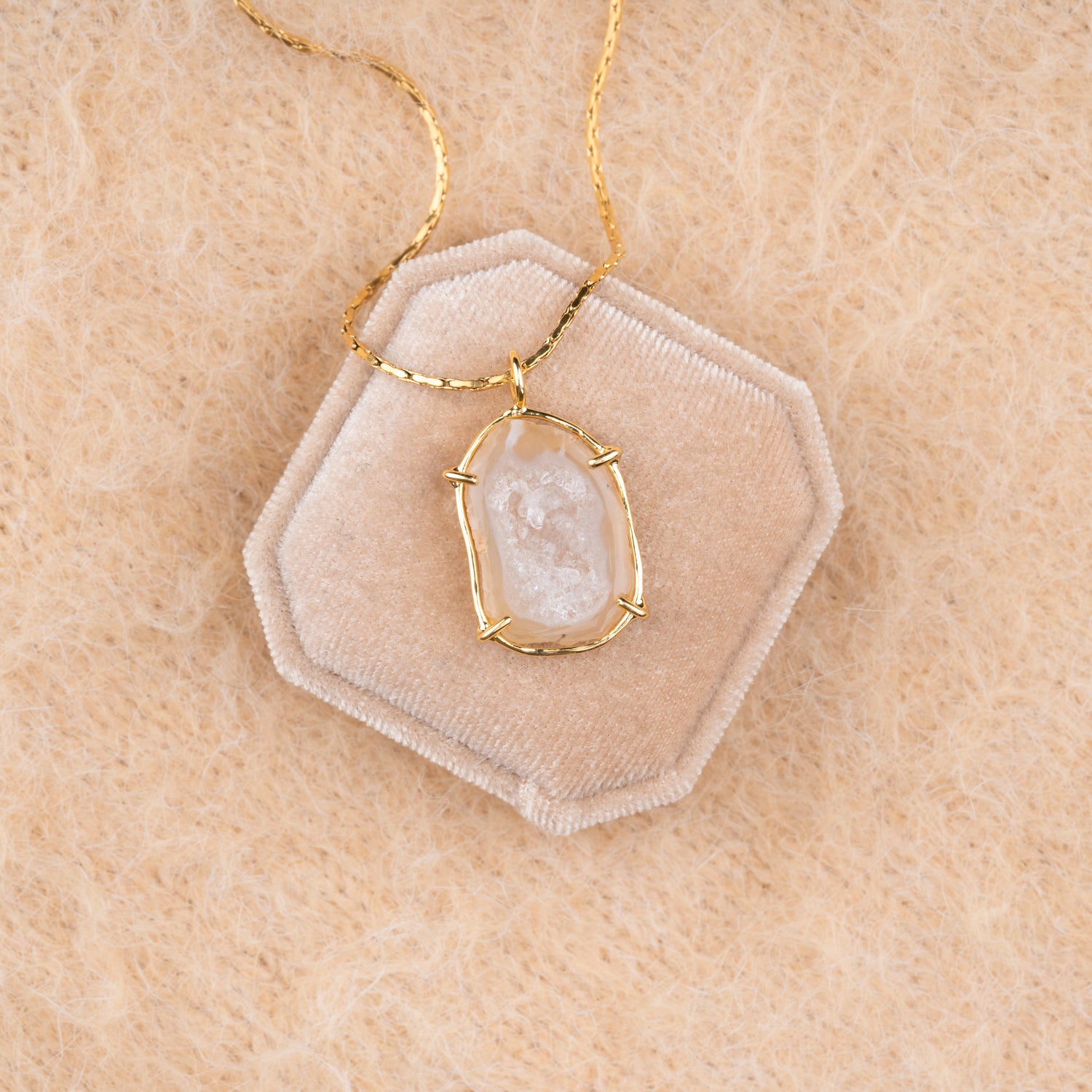 Iedere geode hanger is one-of-a-kind door haar natuurlijke vorm en unieke patronen. Geen twee stenen zijn hetzelfde, waardoor je een sieraad draagt dat écht alleen van jou is. Omdat iedere steen uniek is, is er van elk sieraad maar één beschikbaar — uitverkocht is dus ook écht uitverkocht.