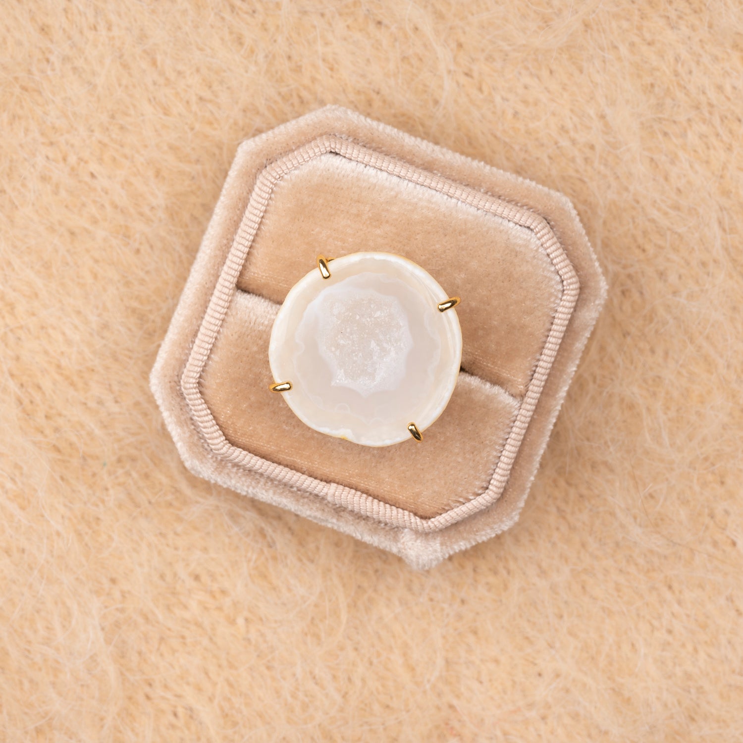 Iedere geode ring is one-of-a-kind door haar natuurlijke vorm en unieke patronen. Geen twee stenen zijn hetzelfde, waardoor je een sieraad draagt dat écht alleen van jou is. Omdat iedere steen uniek is, is er van elk sieraad maar één beschikbaar — uitverkocht is dus ook écht uitverkocht.