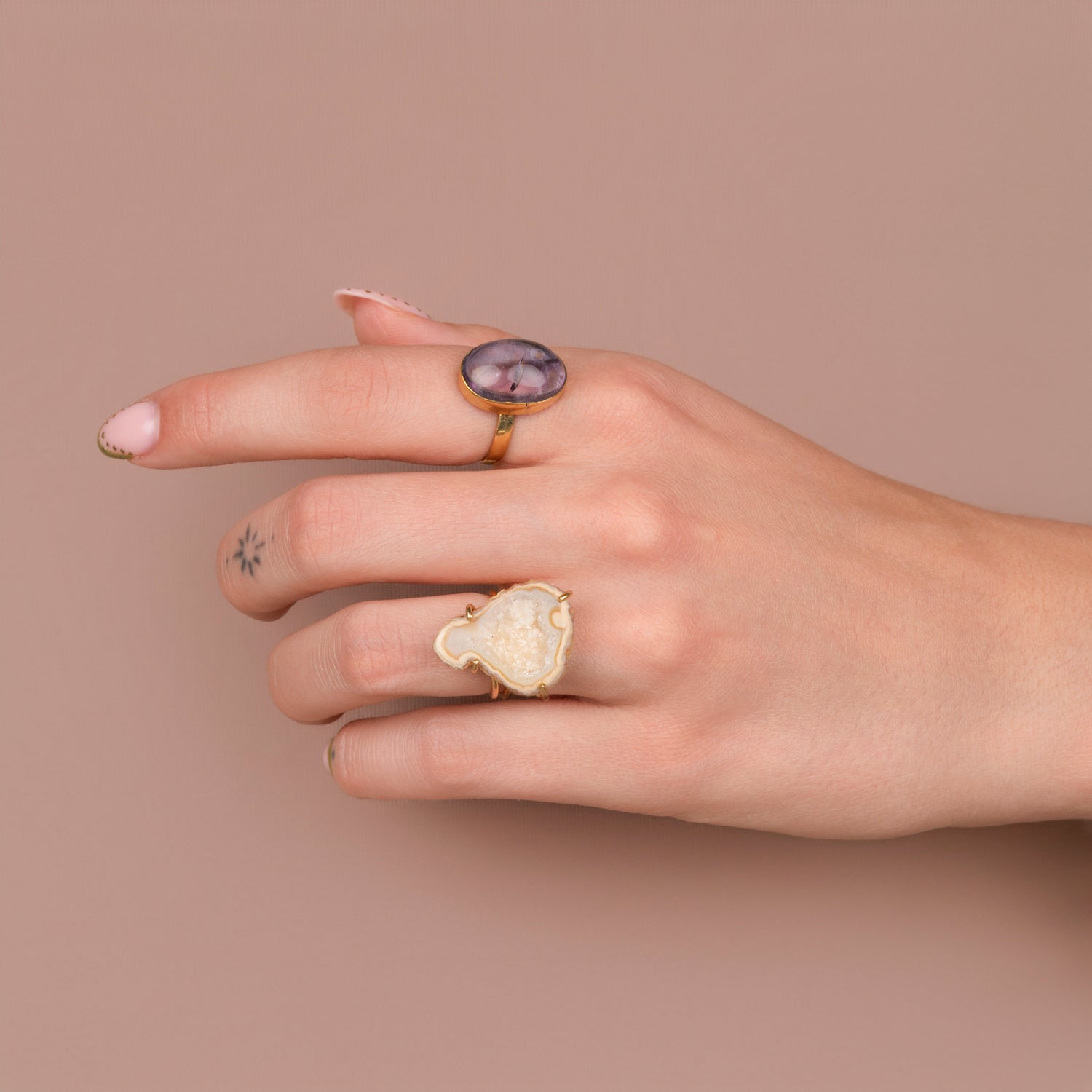 Iedere geode ring is one-of-a-kind door haar natuurlijke vorm en unieke patronen. Geen twee stenen zijn hetzelfde, waardoor je een sieraad draagt dat écht alleen van jou is. Omdat iedere steen uniek is, is er van elk sieraad maar één beschikbaar — uitverkocht is dus ook écht uitverkocht.