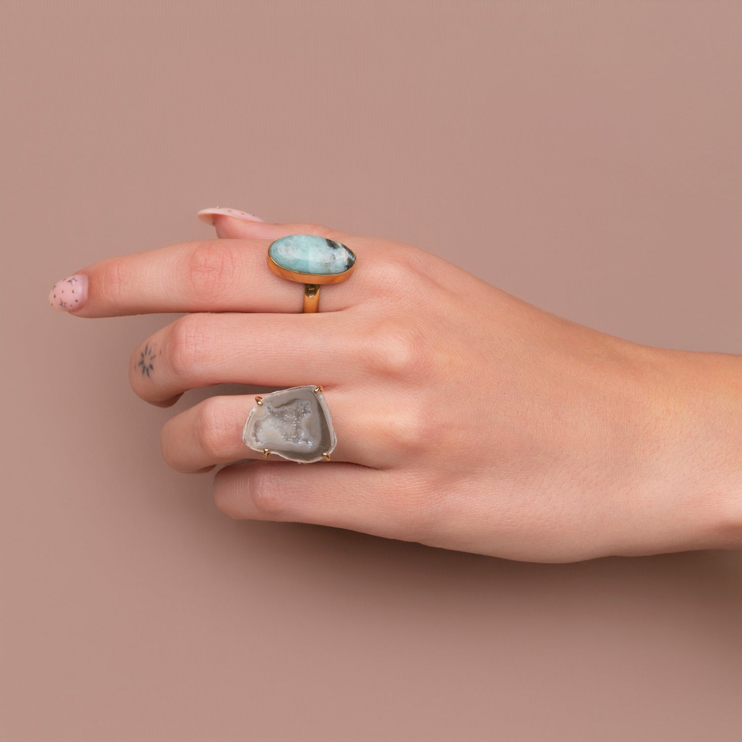 Iedere geode ring is one-of-a-kind door haar natuurlijke vorm en unieke patronen. Geen twee stenen zijn hetzelfde, waardoor je een sieraad draagt dat écht alleen van jou is. Omdat iedere steen uniek is, is er van elk sieraad maar één beschikbaar — uitverkocht is dus ook écht uitverkocht.