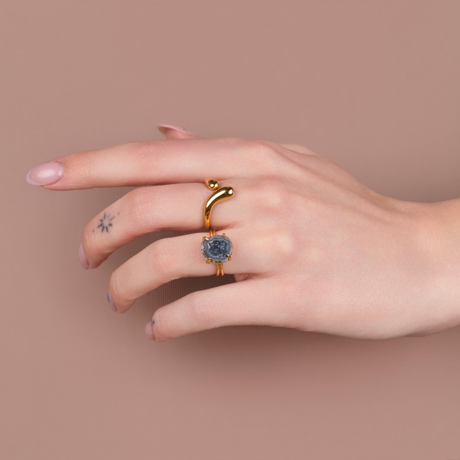 Iedere geode ring is one-of-a-kind door haar natuurlijke vorm en unieke patronen. Geen twee stenen zijn hetzelfde, waardoor je een sieraad draagt dat écht alleen van jou is. Omdat iedere steen uniek is, is er van elk sieraad maar één beschikbaar — uitverkocht is dus ook écht uitverkocht.
